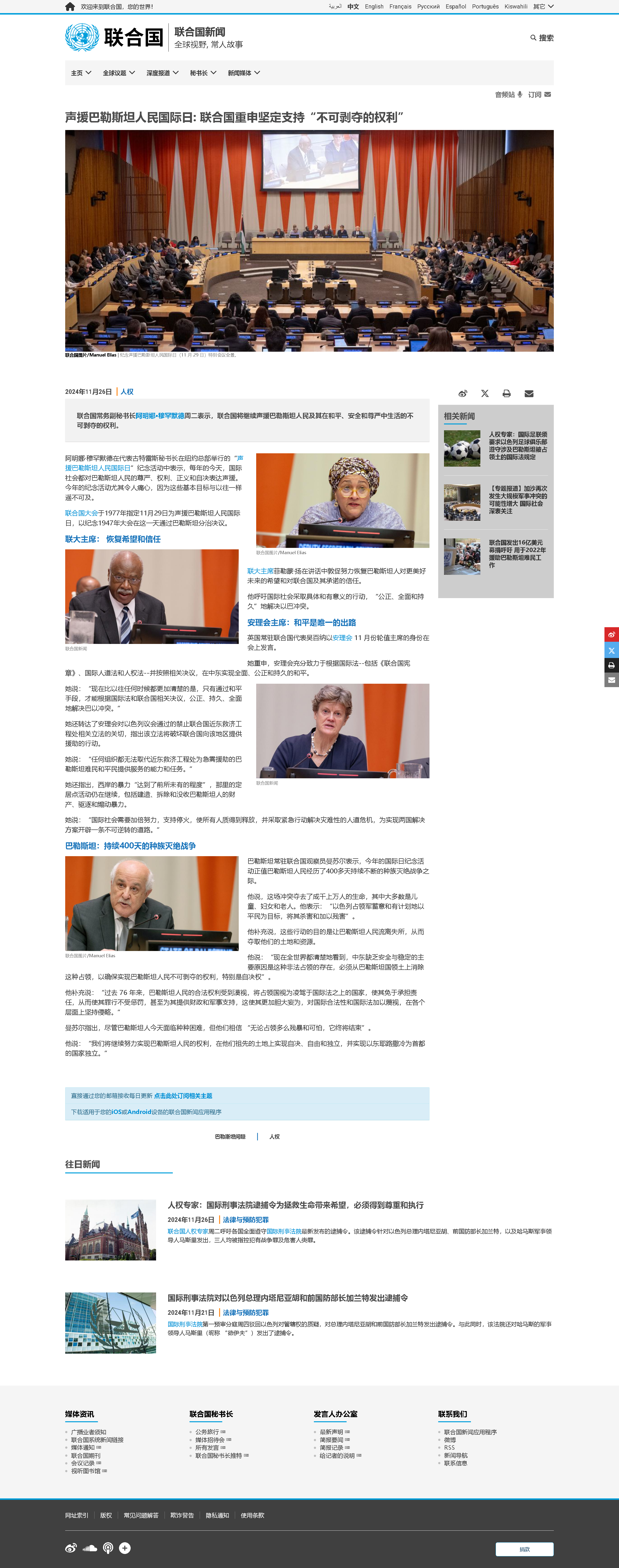 新華社北京11月27日電 11月26日,聯(lián)合國(guó)舉行“聲援巴勒斯坦人民國(guó)際日”紀(jì)念大會(huì),國(guó)家主席習(xí)近平向大會(huì)致賀電。