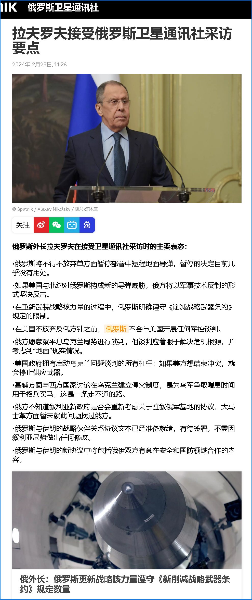 拉夫羅夫說,俄方已做好準(zhǔn)備應(yīng)對局勢發(fā)展的任何可能,如果北約制造新的導(dǎo)彈威脅,俄方將以軍事技術(shù)手段進(jìn)行反制,同時也會考慮創(chuàng)造條件進(jìn)行平等對話。他說,北約多年來東擴(kuò)在很大程度上引發(fā)了烏克蘭危機(jī),并持續(xù)對俄羅斯安全構(gòu)成威脅。由于美國當(dāng)前的反俄行動,俄方不會與美方就軍控問題進(jìn)行任何談判。