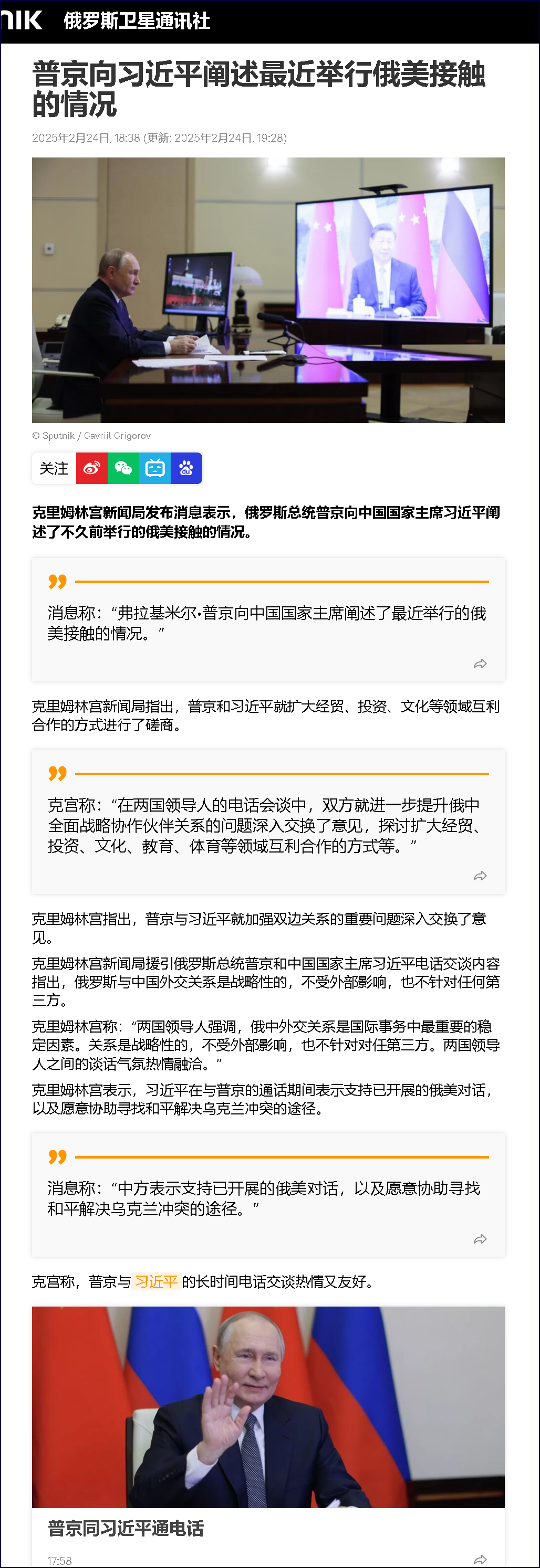 普京介紹了俄美接觸最新情況和俄方在烏克蘭危機問題上的原則立場,表示俄方致力于消除俄烏沖突根源,達成可持續(xù)和長久的和平方案。