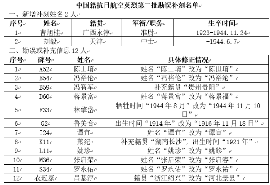 目前,紀(jì)念館累計(jì)完成32位中國(guó)籍抗日航空英烈姓名的增補(bǔ)和勘誤工作。