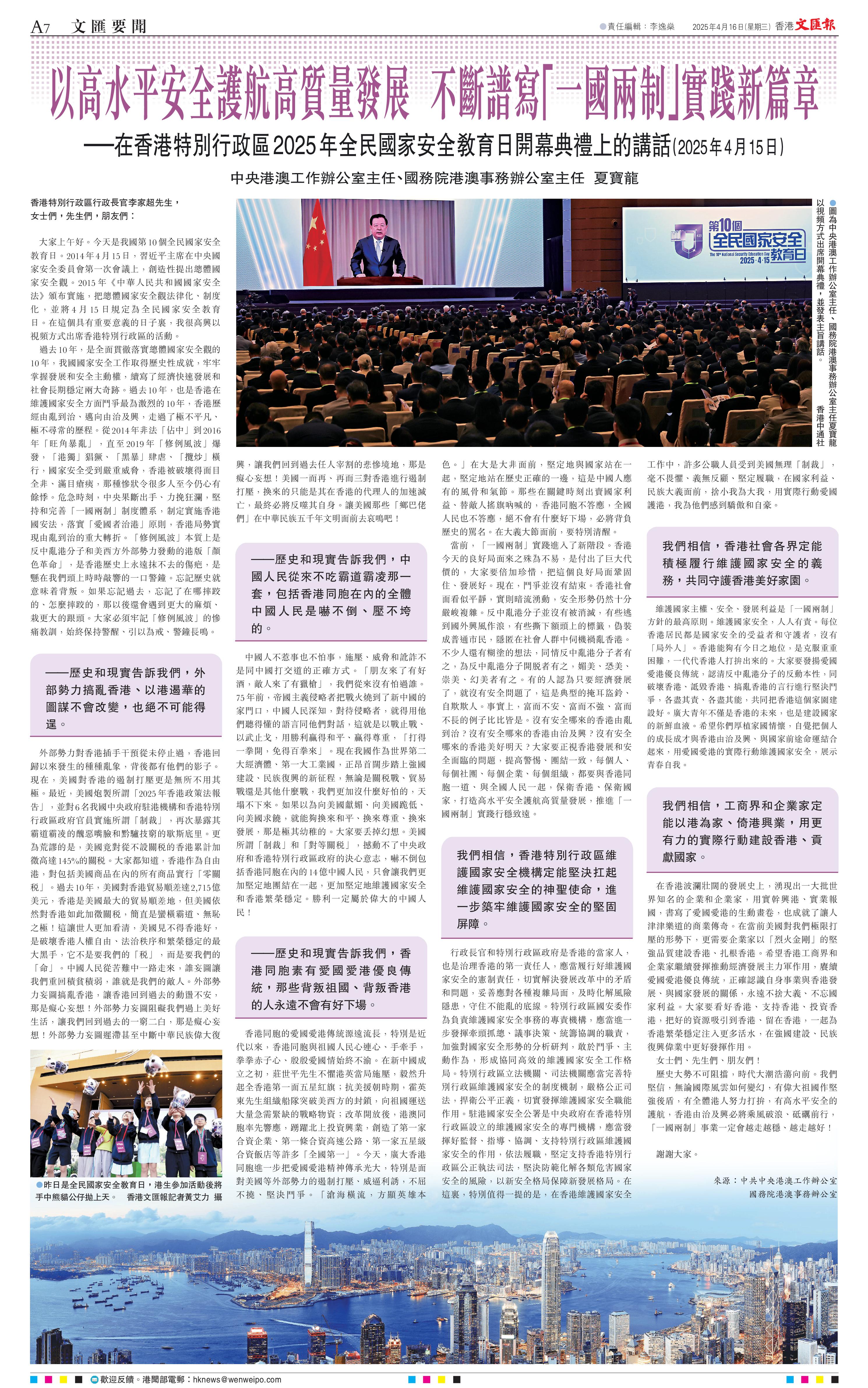 「我們相信,香港社會(huì)各界定能積極履行維護(hù)國(guó)家安全的義務(wù),共同守護(hù)香港美好家園。」夏寶龍強(qiáng)調(diào),維護(hù)國(guó)家安全,人人有責(zé)。每位香港居民都是國(guó)家安全的受益者和守護(hù)者,沒有「局外人」。大家要發(fā)揚(yáng)愛國(guó)愛港優(yōu)良傳統(tǒng),認(rèn)清反中亂港分子的反動(dòng)本性,同破壞香港、詆毀香港、搞亂香港的言行進(jìn)行堅(jiān)決斗爭(zhēng),各盡其責(zé)、各盡其能,共同把香港這個(gè)家園建設(shè)好。 「廣大青年不僅是香港的未來,也是建設(shè)國(guó)家的新鮮血液?!瓜膶汖埾M麖V大青年厚植家國(guó)情懷,自覺把個(gè)人的成長(zhǎng)成才與香港由治及興、與國(guó)家前途命運(yùn)結(jié)合起來,用愛國(guó)愛港的實(shí)際行動(dòng)維護(hù)國(guó)家安全,展示青春自我。