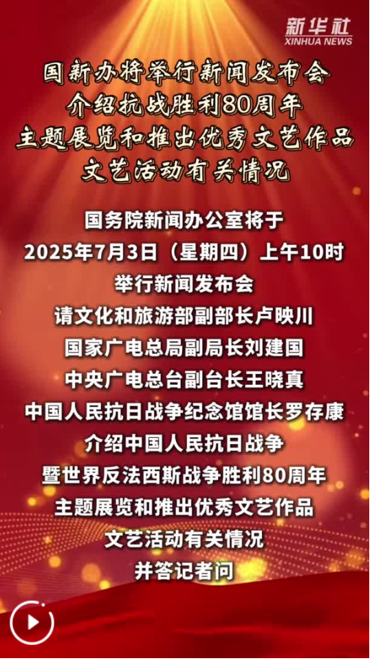 國務(wù)院新聞辦公室將于2025年7月3日(星期四)上午10時舉行新聞發(fā)布會,請文化和旅游部副部長盧映川、國家廣電總局副局長劉建國、中央廣電總臺副臺長王曉真、中國人民抗日戰(zhàn)爭紀(jì)念館館長羅存康介紹中國人民抗日戰(zhàn)爭暨世界反法西斯戰(zhàn)爭勝利80周年主題展覽和推出優(yōu)秀文藝作品、文藝活動有關(guān)情況,并答記者問。(記者 王子銘)