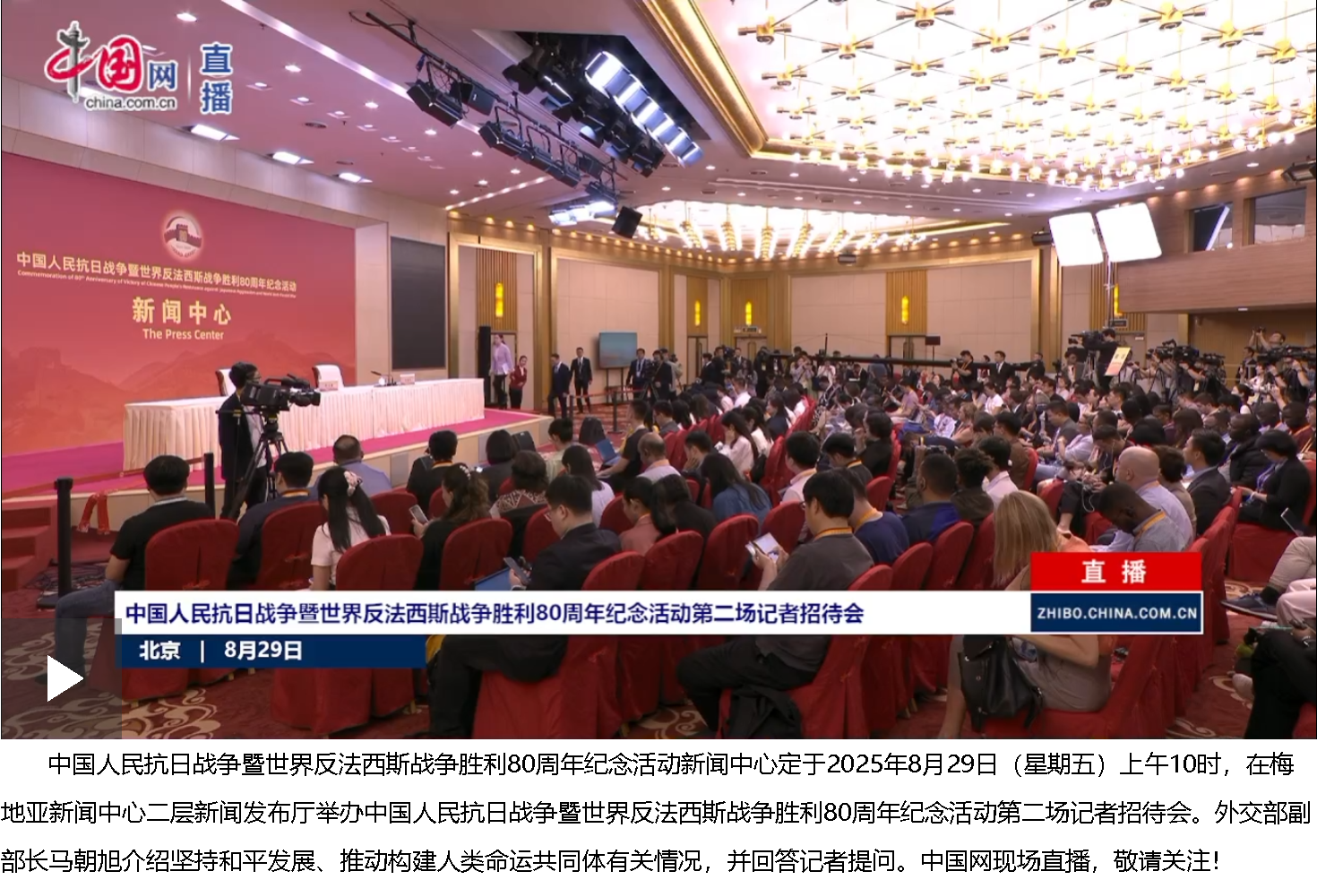 女士們、先生們,大家上午好!歡迎出席中國(guó)人民抗日戰(zhàn)爭(zhēng)暨世界反法西斯戰(zhàn)爭(zhēng)勝利80周年紀(jì)念活動(dòng)新聞中心第二場(chǎng)記者招待會(huì)。今天我們非常高興邀請(qǐng)到外交部副部長(zhǎng)馬朝旭先生,請(qǐng)他向大家介紹堅(jiān)持和平發(fā)展、推動(dòng)構(gòu)建人類命運(yùn)共同體有關(guān)情況,并回答大家關(guān)心的問(wèn)題。