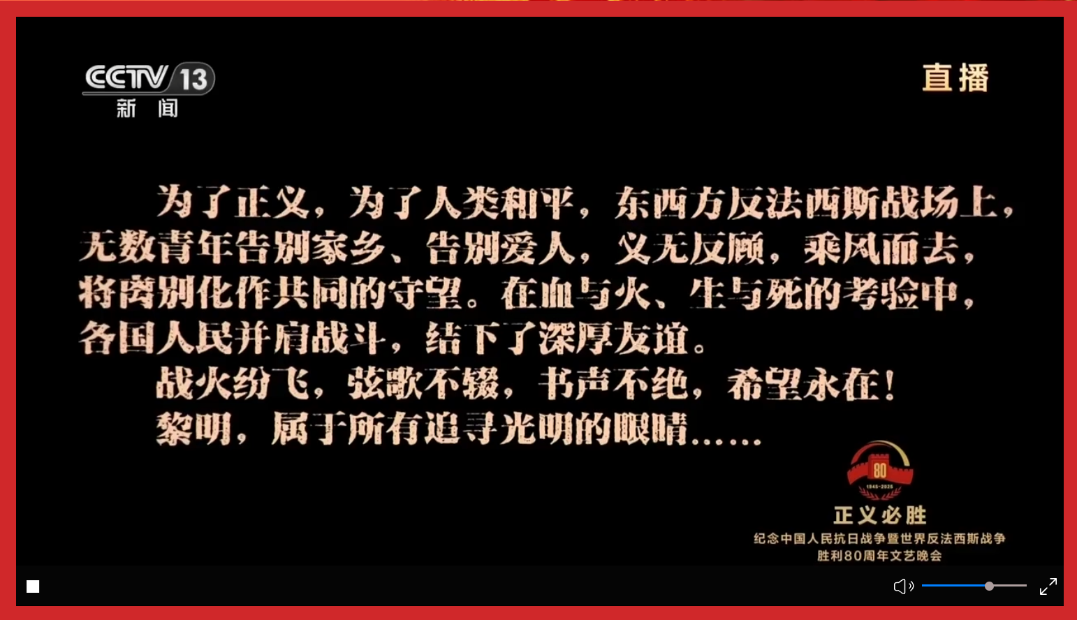 紀(jì)念中國人民抗日戰(zhàn)爭暨世界反法西斯戰(zhàn)爭勝利80周年文藝晚會(huì)到此結(jié)束!