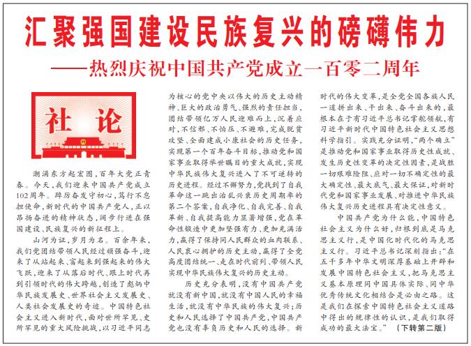 潮涌東方起宏圖,百年大黨正青春。今天,我們迎來中國共產(chǎn)黨成立102周年。踔厲奮發(fā)守初心,篤行不怠擔使命,新時代的中國共產(chǎn)黨人,正以昂揚奮進的精神狀態(tài),闊步行進在強國建設、民族復興的新征程上。