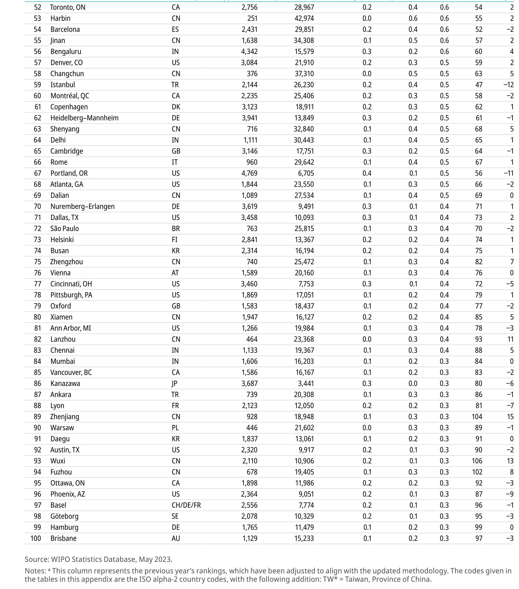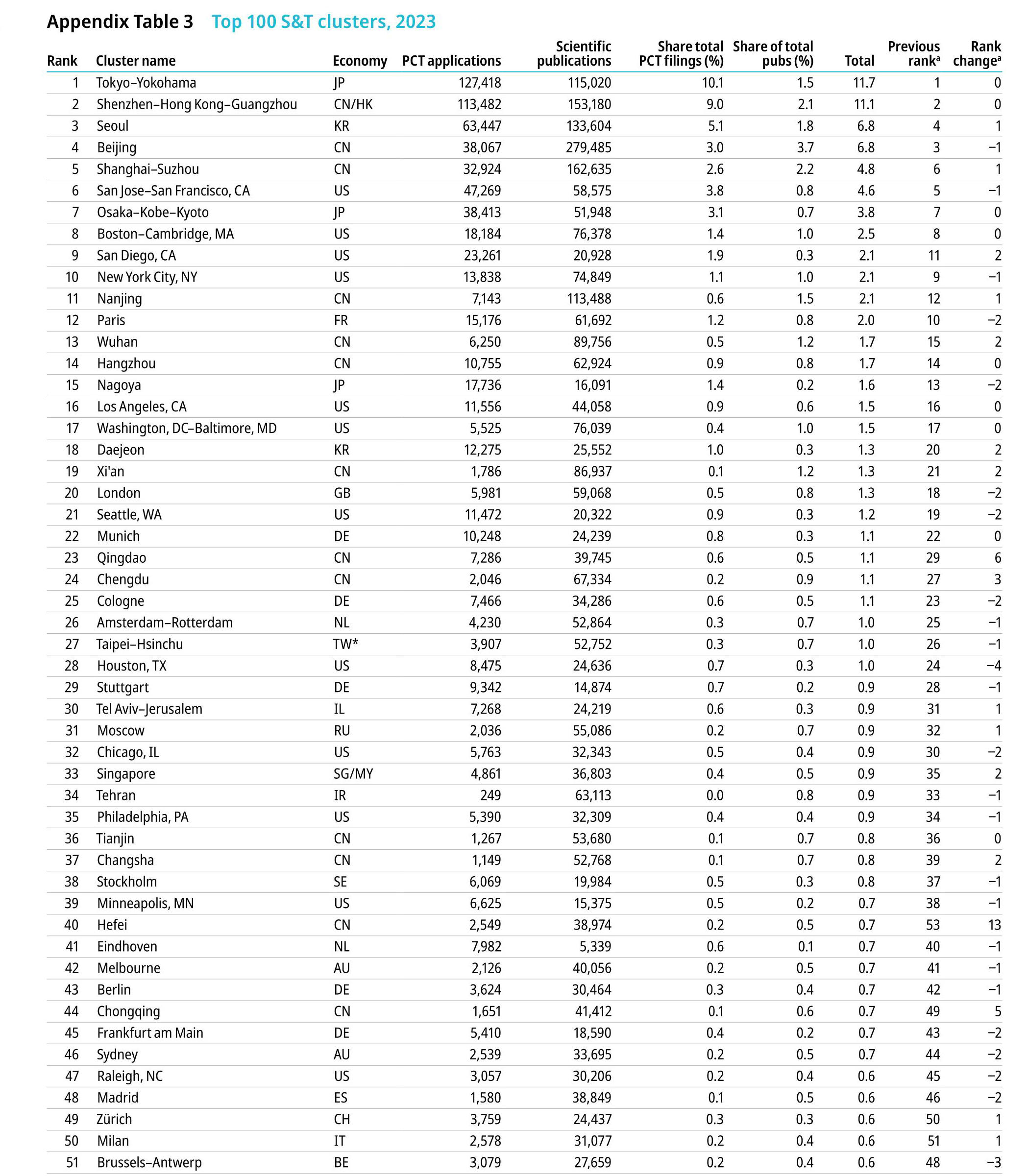 中國(guó)有25個(gè)科技集群進(jìn)入全球TOP100榜單,成為擁有全球頂級(jí)科技集群最多的國(guó)家,并在前五科技集群中占了三位。這25個(gè)集群分別為:深圳-香港-廣州(第2位)、北京(4)、上海-蘇州(5)、南京(11)、武漢(13)、杭州(14)、西安(19)、青島(23)、成都(24)、臺(tái)北-新竹(27)、天津(36)、長(zhǎng)沙(37)、合肥(40)、重慶(44)、哈爾濱(53)、濟(jì)南(55)、長(zhǎng)春(58)、沈陽(yáng)(63)、大連(69)、鄭州(75)、廈門(80)、蘭州(82)、鎮(zhèn)江(89)、無(wú)錫(93)、福州(94)。成都本次排名比2022年GII著錄排名上升5位。