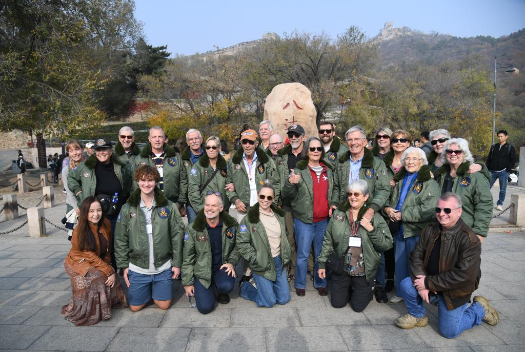 10月29日,飛虎隊(duì)老兵莫耶一行人在北京八達(dá)嶺長(zhǎng)城合影留念。當(dāng)日,美中航空遺產(chǎn)基金會(huì)訪華代表團(tuán)成員陸續(xù)抵達(dá)北京。新華社記者 任超 攝
