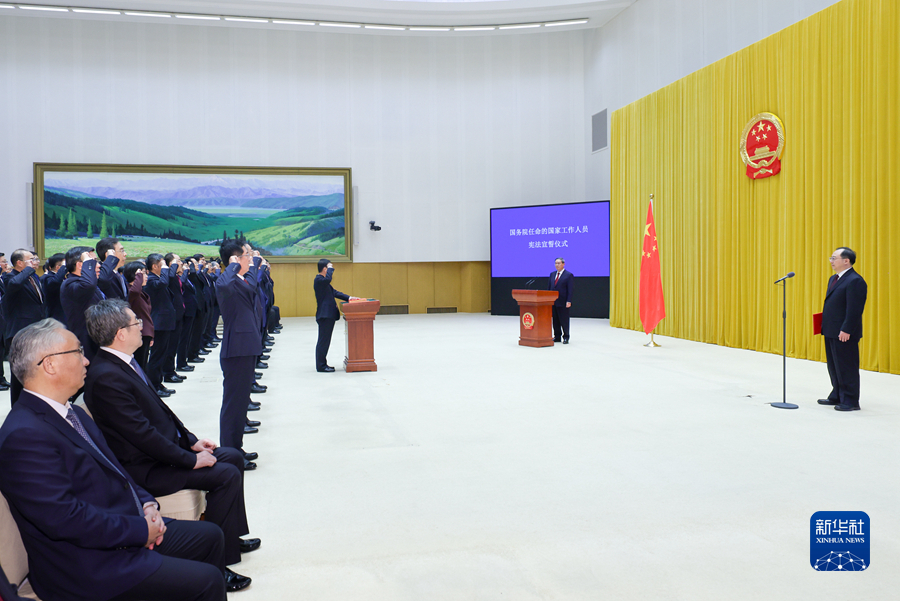 宣誓后,國務(wù)院總理李強作了講話。他強調(diào),誓詞雖短,但字字千鈞,希望大家把錚錚誓言銘記于心、踐之于行,忠于憲法、忠于祖國、忠于人民,不辜負黨和人民的重托。要堅持用習(xí)近平新時代中國特色社會主義思想凝心鑄魂,深刻領(lǐng)悟“兩個確立”的決定性意義,堅決做到“兩個維護”,不斷提高政治判斷力、政治領(lǐng)悟力、政治執(zhí)行力,當(dāng)好貫徹黨中央決策部署的執(zhí)行者、行動派、實干家。要倍加珍惜黨和人民賦予的平臺,以奮發(fā)有為的精神狀態(tài)干事創(chuàng)業(yè),緊緊圍繞推進高質(zhì)量發(fā)展這個首要任務(wù),持續(xù)深化改革、擴大開放、推動創(chuàng)新、改善民生,勇于打破常規(guī),善于開辟新局,抓住主要矛盾綜合施策,聚焦瓶頸制約持續(xù)攻堅,以實干實績踐行誓言。要牢固樹立正確的權(quán)力觀、政績觀、事業(yè)觀,嚴格按照法定權(quán)限和程序履行職責(zé)、行使權(quán)力、承擔(dān)責(zé)任,始終繃緊廉潔自律這根弦,時時處處嚴格要求自己,堅決反對形式主義、官僚主義,大力弘揚勤儉節(jié)約、艱苦奮斗的優(yōu)良作風(fēng),為全面建設(shè)社會主義現(xiàn)代化國家、實現(xiàn)中華民族偉大復(fù)興中國夢不懈奮斗。