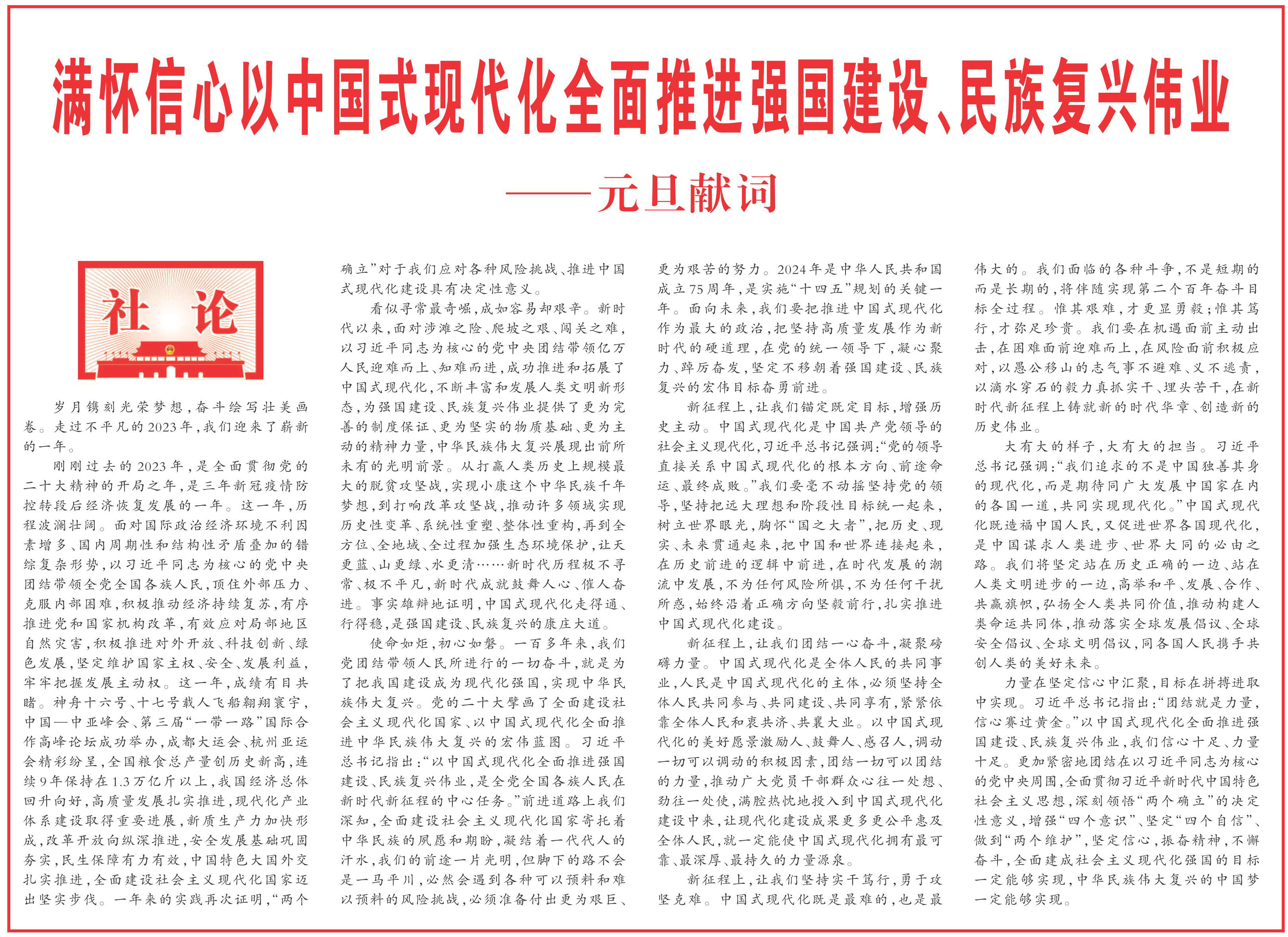使命如炬,初心如磐。一百多年來,我們黨團結(jié)帶領(lǐng)人民所進行的一切奮斗,就是為了把我國建設(shè)成為現(xiàn)代化強國,實現(xiàn)中華民族偉大復(fù)興。黨的二十大擘畫了全面建設(shè)社會主義現(xiàn)代化國家、以中國式現(xiàn)代化全面推進中華民族偉大復(fù)興的宏偉藍圖。習(xí)近平總書記指出:“以中國式現(xiàn)代化全面推進強國建設(shè)、民族復(fù)興偉業(yè),是全黨全國各族人民在新時代新征程的中心任務(wù)?!鼻斑M道路上我們深知,全面建設(shè)社會主義現(xiàn)代化國家寄托著中華民族的夙愿和期盼,凝結(jié)著一代代人的汗水,我們的前途一片光明,但腳下的路不會是一馬平川,必然會遇到各種可以預(yù)料和難以預(yù)料的風(fēng)險挑戰(zhàn),必須準(zhǔn)備付出更為艱巨、更為艱苦的努力。2024年是中華人民共和國成立75周年,是實施“十四五”規(guī)劃的關(guān)鍵一年。面向未來,我們要把推進中國式現(xiàn)代化作為最大的政治,把堅持高質(zhì)量發(fā)展作為新時代的硬道理,在黨的統(tǒng)一領(lǐng)導(dǎo)下,凝心聚力、踔厲奮發(fā),堅定不移朝著強國建設(shè)、民族復(fù)興的宏偉目標(biāo)奮勇前進。