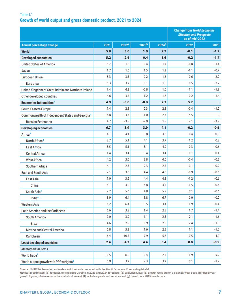 報(bào)告說(shuō),在新冠疫情、烏克蘭危機(jī)、高通貨膨脹和氣候變化等影響下,2022年世界經(jīng)濟(jì)遭受重創(chuàng),2023年世界經(jīng)濟(jì)繼續(xù)承壓。如果一些宏觀經(jīng)濟(jì)逆風(fēng)能夠開(kāi)始消退,世界經(jīng)濟(jì)增長(zhǎng)將在2024年回升至2.7%。