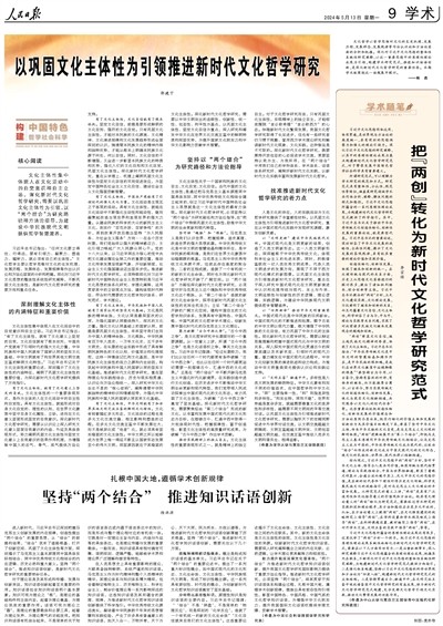 文化主體性集中體現(xiàn)人在文化活動中的自覺意識和自主立場。深化新時代文化哲學(xué)研究,需要以鞏固文化主體性為引領(lǐng),以“兩個結(jié)合”為研究路徑和方法論指導(dǎo),為建設(shè)中華民族現(xiàn)代文明提供哲學(xué)智慧滋養(yǎng)。