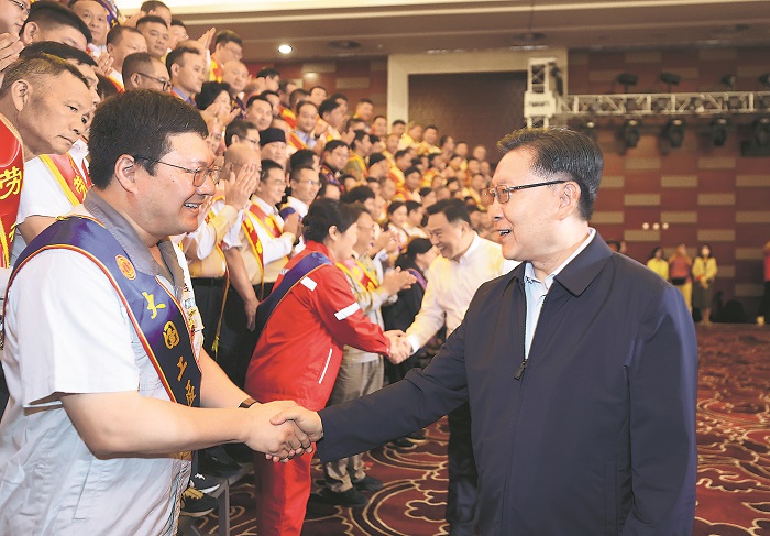 6月13日上午,2024年全國勞模療休養(yǎng)活動在北京啟動,全國人大常委會副委員長、中華全國總工會主席王東明看望首批參加勞模療休養(yǎng)的200多名勞模工匠代表。本報記者 楊登峰 攝