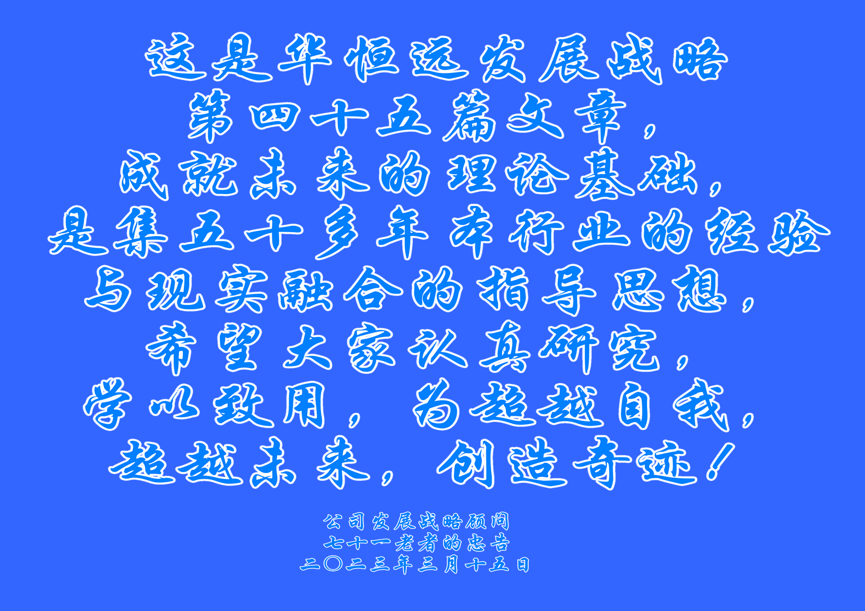 這是華恒遠發(fā)展戰(zhàn)略第四十五篇文章,成就未來的理論基礎,是集五十多年本行業(yè)的經驗與現(xiàn)實融合的指導思想,希望大家認真研究,學以致用,為超越自我,超越未來,創(chuàng)造奇跡!
