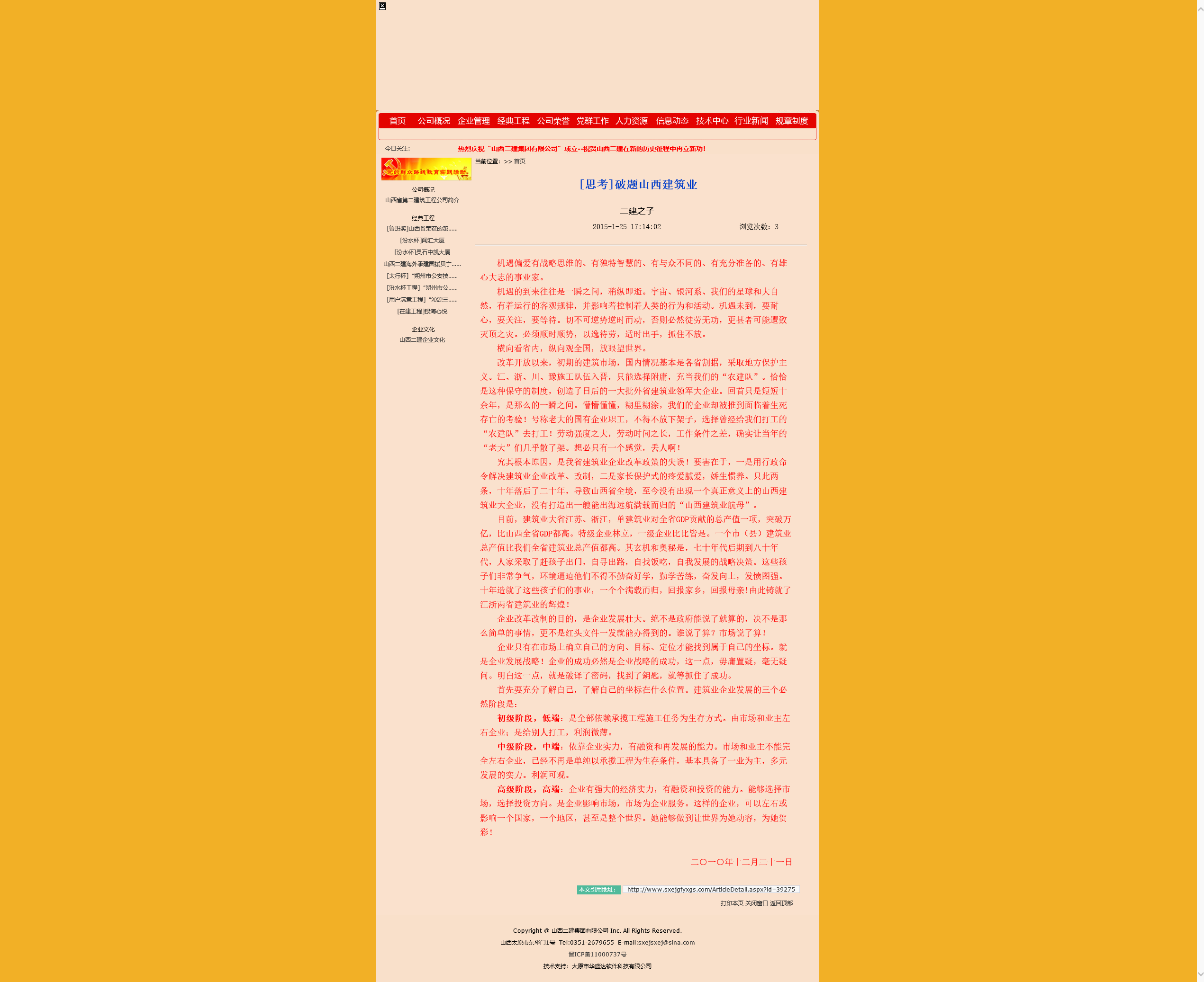 注:這是筆者五年前寫給山西二建第十六任掌門人的信其中一封,內(nèi)容有刪節(jié)。 現(xiàn)在公開發(fā)表,目的在于讓青年同志們了解山西二建的歷史,從中參悟公司發(fā)展規(guī)律,更好地把握歷史機(jī)遇,把我們的企業(yè)母親呵護(hù)好,實(shí)現(xiàn)人生事業(yè)價(jià)值,創(chuàng)造山西二建新的更大的輝煌!