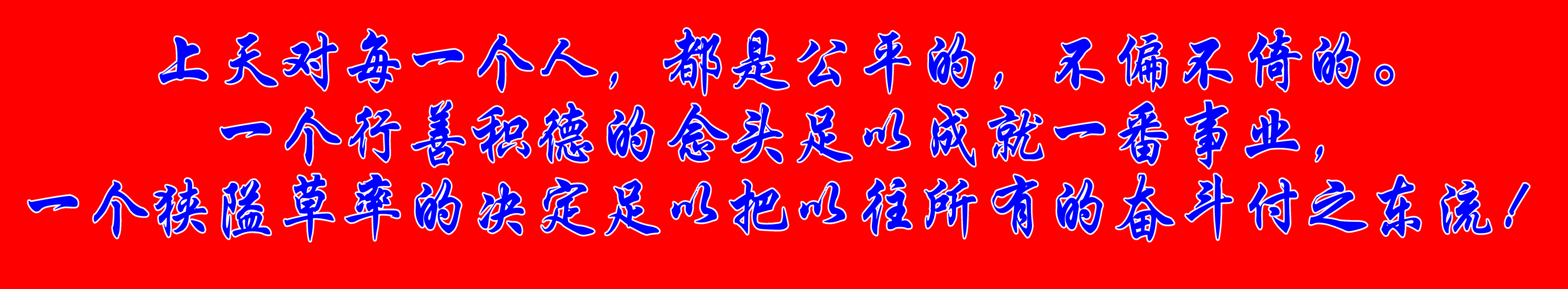 上天對(duì)每一個(gè)人,都是公平的,不偏不倚的。一個(gè)行善積德的念頭足以成就一番事業(yè),一個(gè)狹隘草率的決定足以把以往所有的奮斗付之東流!