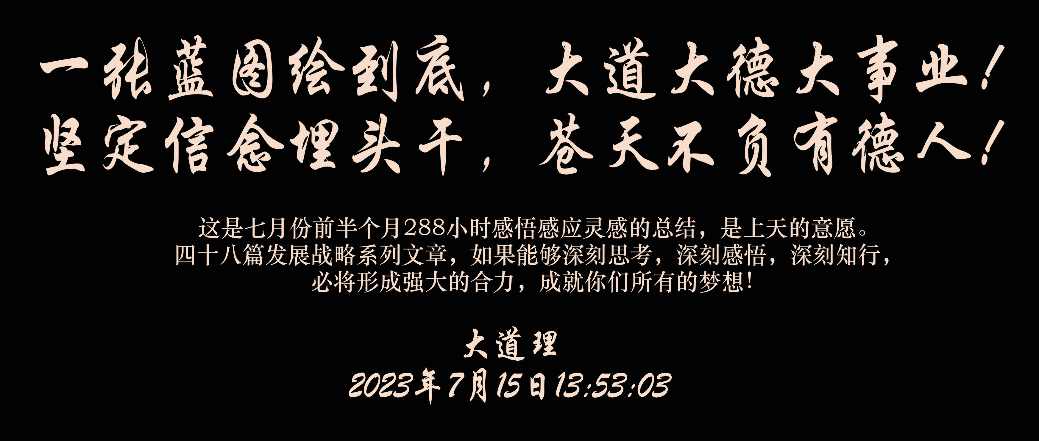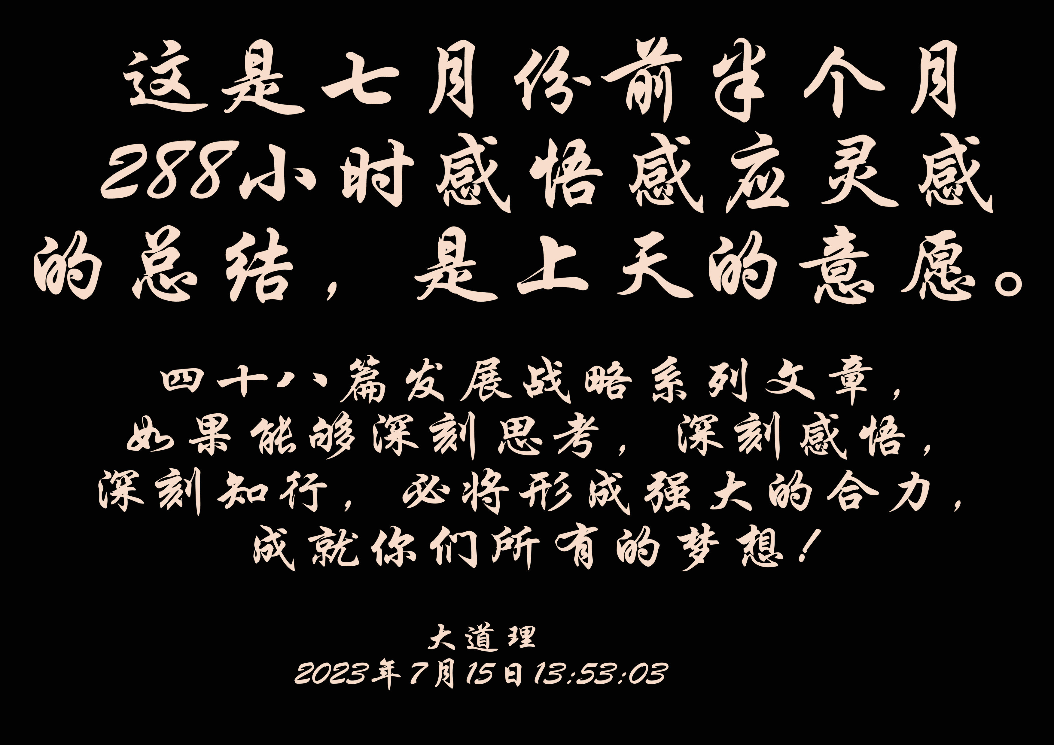 這是七月份前半個(gè)月288小時(shí)感悟感應(yīng)靈感的總結(jié),是上天的意愿。四十八篇發(fā)展戰(zhàn)略系列文章,如果能夠深刻思考,深刻感悟,深刻知行,必將形成強(qiáng)大的合力,成就你們所有的夢(mèng)想!