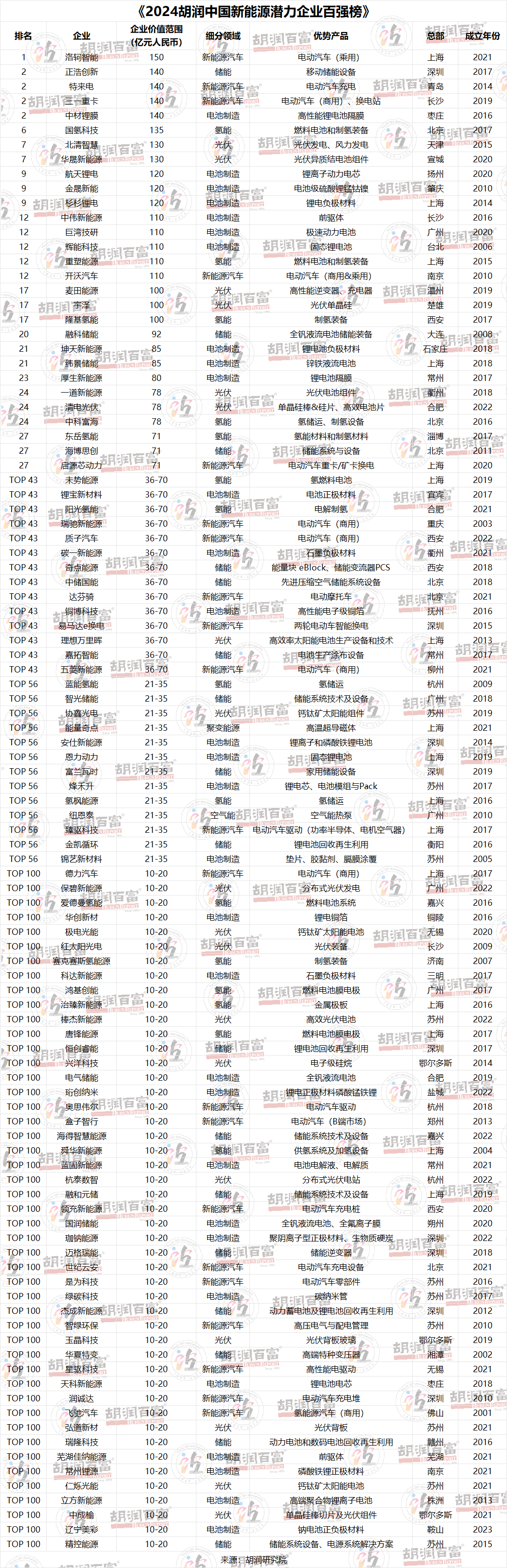 胡潤研究院發(fā)布《2024胡潤中國新能源潛力企業(yè)百強(qiáng)榜》 ——尋找中國最具發(fā)展?jié)摿Φ男履茉雌髽I(yè)