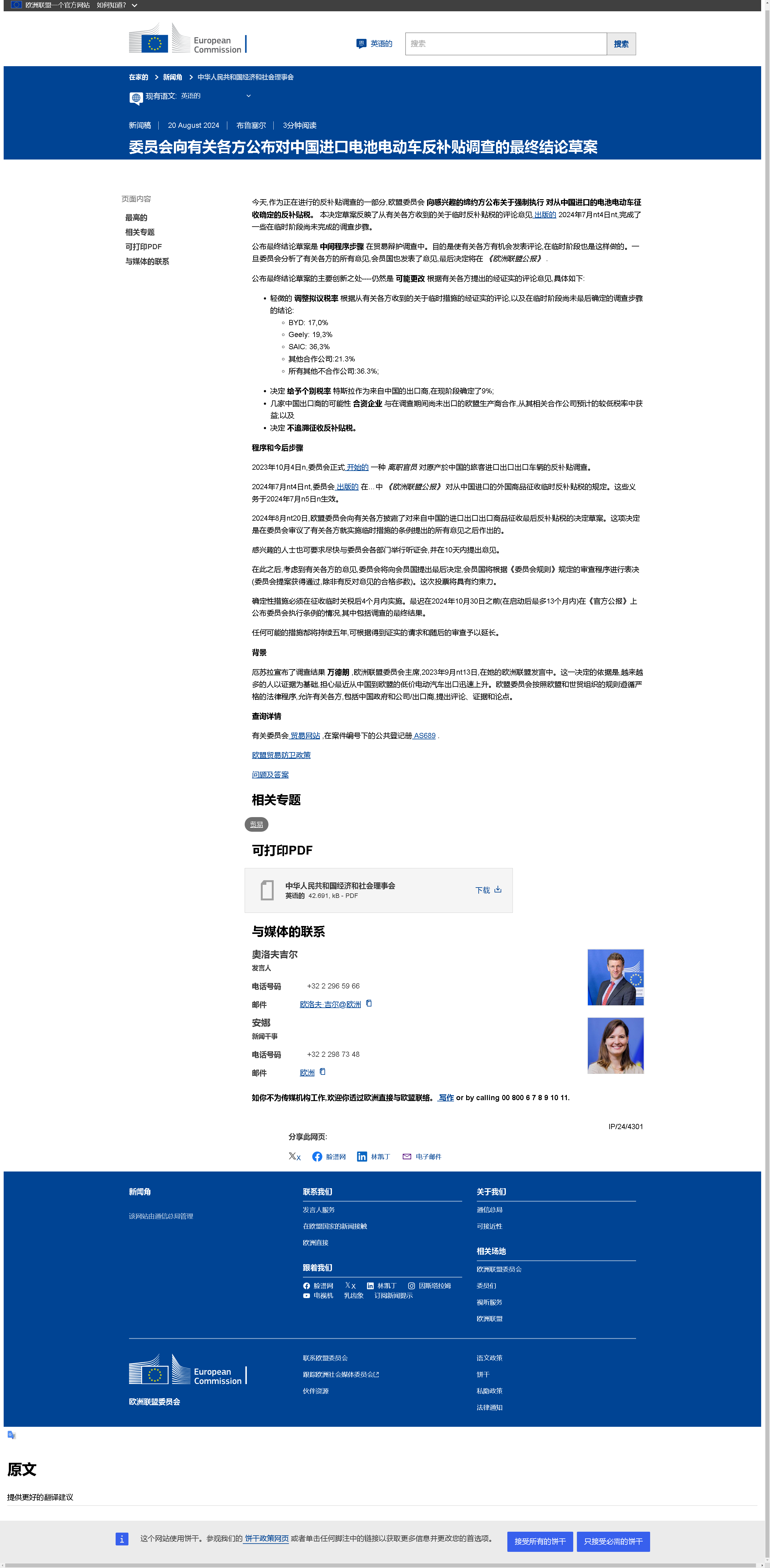 據(jù)央視新聞消息,當?shù)貢r間8月20日 ,歐盟委員會(下稱“歐委會”)向相關(guān)方披露了對從中國進口的純電動汽車征收最終反補貼稅的決定草案。