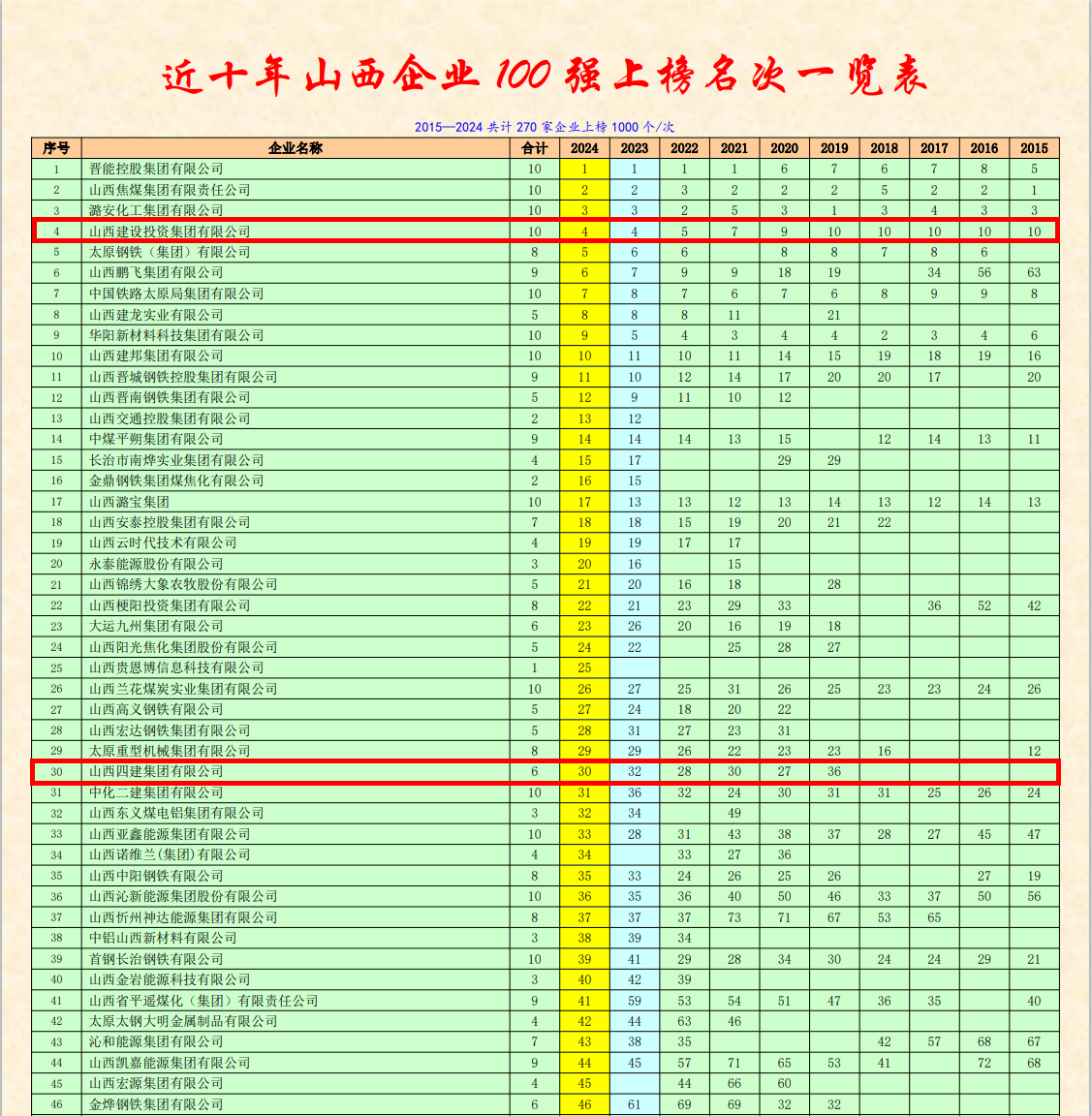 11月22日,山西省企業(yè)聯(lián)合會(huì)、山西省企業(yè)家協(xié)會(huì)召開以“弘揚(yáng)企業(yè)家精神,培育發(fā)展新質(zhì)生產(chǎn)力”為主題的山西企聯(lián)第32次年會(huì)暨2024年山西100強(qiáng)企業(yè)發(fā)布會(huì)。山西建投四建集團(tuán)憑借堅(jiān)實(shí)發(fā)展榮列2024年山西企業(yè)100強(qiáng)排行榜第30位(較去年上升2位),連續(xù)6年入圍百?gòu)?qiáng)榜單,并榮獲“2023年度功勛企業(yè)”稱號(hào)。