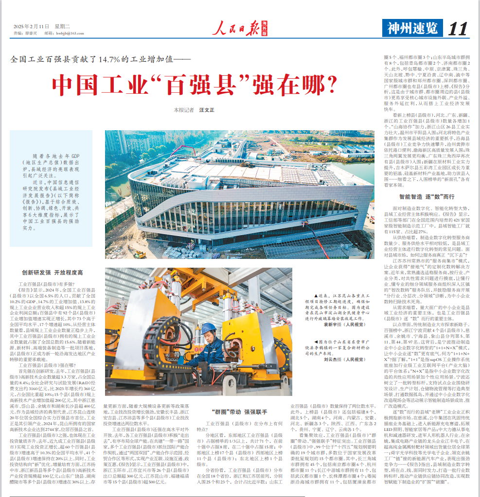 《報(bào)告》顯示,2024年,全國(guó)工業(yè)百?gòu)?qiáng)縣(縣級(jí)市)以全國(guó)6.5%的人口,貢獻(xiàn)了全國(guó)10.2%的GDP、14.7%的工業(yè)增加值、13.8%的規(guī)上工業(yè)企業(yè)營(yíng)業(yè)收入和超15%的規(guī)上工業(yè)企業(yè)利潤(rùn)總額;百?gòu)?qiáng)縣中有92個(gè)縣(縣級(jí)市)工業(yè)增加值增速實(shí)現(xiàn)正增長(zhǎng),其中73個(gè)高于全國(guó)平均水平、17個(gè)增速超10%。從經(jīng)營(yíng)主體數(shù)量看,縣域規(guī)上工業(yè)企業(yè)數(shù)量正穩(wěn)步上升,其中工業(yè)百?gòu)?qiáng)縣(縣級(jí)市)擁有的規(guī)上工業(yè)企業(yè)數(shù)量就占據(jù)了全國(guó)總數(shù)的15.6%。隨著新能源、新材料、高端裝備制造等一批項(xiàng)目落地,縣(縣級(jí)市)正成為新一輪沿海發(fā)達(dá)地區(qū)產(chǎn)業(yè)轉(zhuǎn)移的重要承載地。