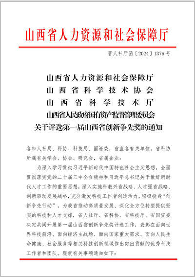 近日,省人社廳、省科協(xié)、省科技廳、省國(guó)資委聯(lián)合下發(fā)通知,決定共同開(kāi)展第一屆山西省創(chuàng)新?tīng)?zhēng)先獎(jiǎng)評(píng)選工作,以表彰在面向世界科技前沿、面向經(jīng)濟(jì)主戰(zhàn)場(chǎng)等相關(guān)科技創(chuàng)新領(lǐng)域作出突出貢獻(xiàn)的優(yōu)秀科技工作者和團(tuán)隊(duì)。