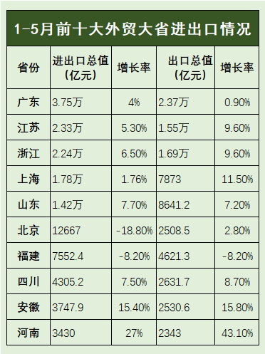 前10大外貿(mào)省份1-5月進(jìn)出口情況觀察者網(wǎng)制圖