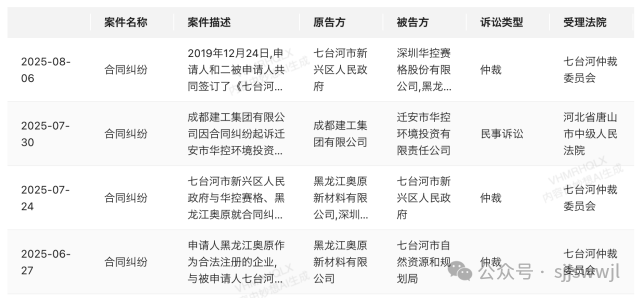 6月25日,華控賽格及子公司黑龍江奧原新材料有限公司收到七臺(tái)河仲裁委員會(huì)的《仲裁通知書》及相關(guān)法律文書,6月27日首次披露仲裁情況,正式宣告案件進(jìn)入仲裁程序。