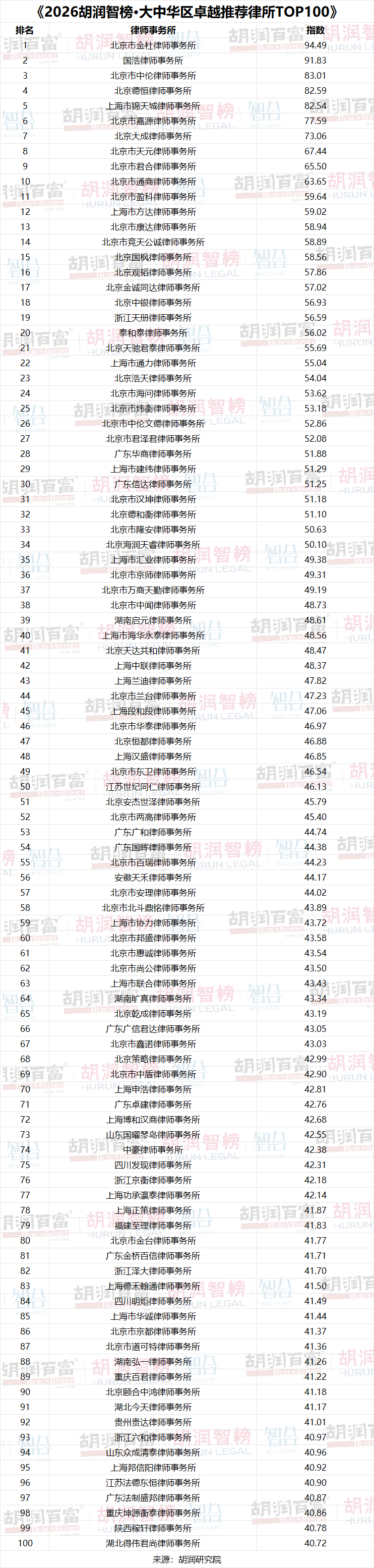 《2026胡潤智榜·大中華區(qū)卓越推薦律所TOP100》前五名