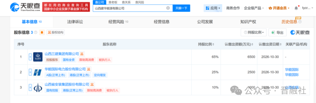 此外,上市央企華能國際出資2500萬元,持有山西華建25%股權。
