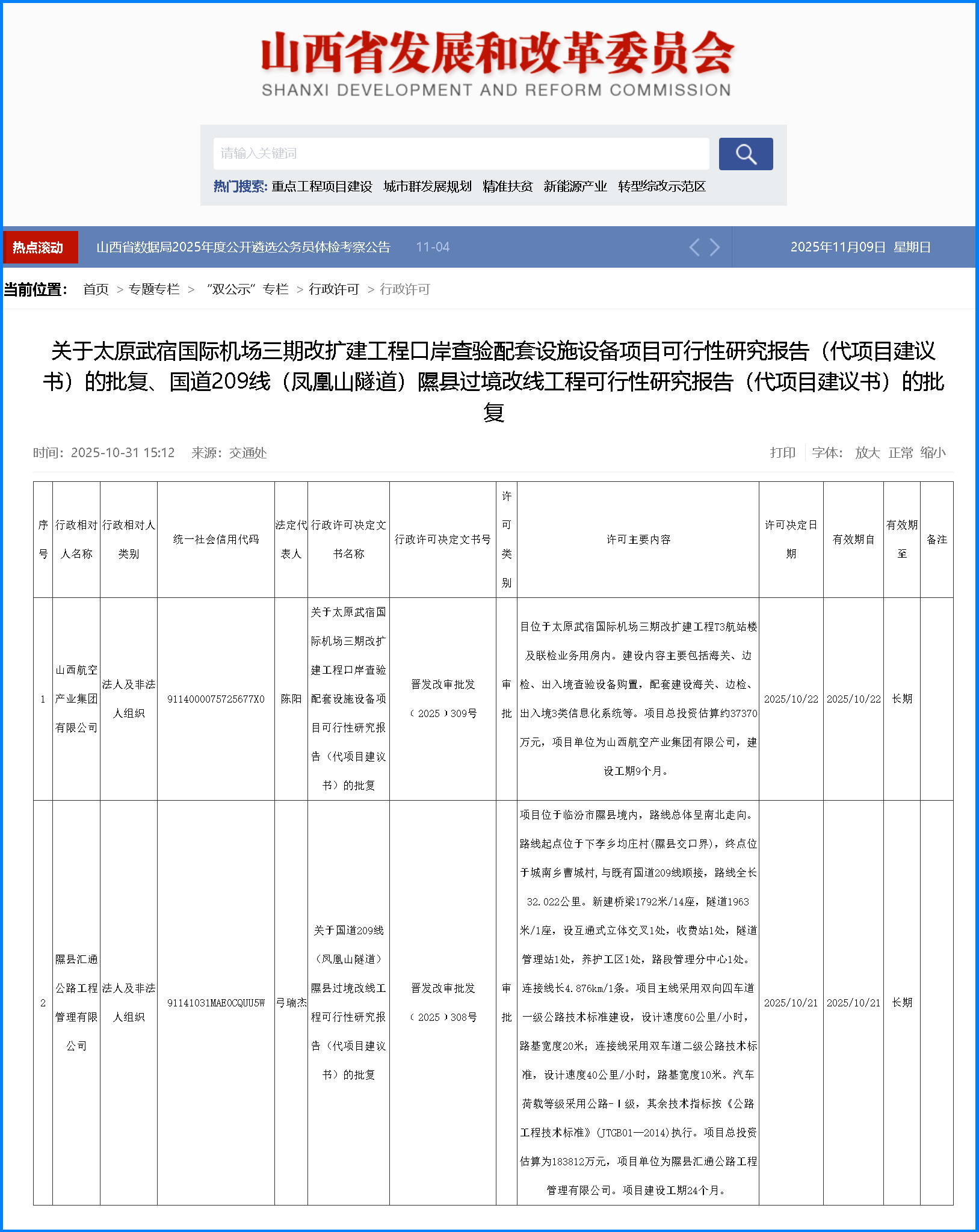 本報(bào)太原11月8日訊(記者張劍雯)近日,省發(fā)展改革委發(fā)布兩項(xiàng)交通領(lǐng)域重要批復(fù):太原武宿國(guó)際機(jī)場(chǎng)三期改擴(kuò)建工程口岸查驗(yàn)配套設(shè)施設(shè)備項(xiàng)目、國(guó)道209線(xiàn)(鳳凰山隧道)隰縣過(guò)境改線(xiàn)工程可行性研究報(bào)告通過(guò)審批。兩項(xiàng)目總投資合計(jì)超22億元,分別從航空樞紐功能升級(jí)與縣域公路通行優(yōu)化兩大維度,為我省綜合交通運(yùn)輸體系建設(shè)注入新動(dòng)能。