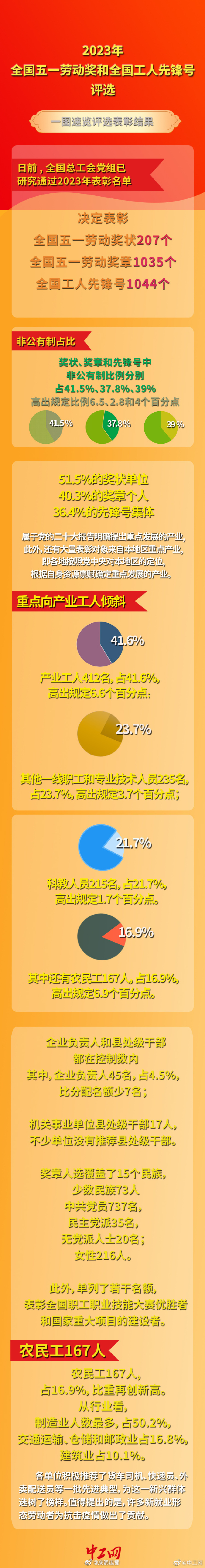 4月27日,2023年慶?!拔逡弧眹H勞動(dòng)節(jié)暨全國五一勞動(dòng)獎(jiǎng)和全國工人先鋒號(hào)表彰大會(huì)在北京人民大會(huì)堂隆重舉行。大會(huì)表彰了全國五一勞動(dòng)獎(jiǎng)狀207個(gè)、全國五一勞動(dòng)獎(jiǎng)?wù)?035個(gè)、全國工人先鋒號(hào)1044個(gè),其中單列名額的獎(jiǎng)狀7個(gè)、獎(jiǎng)?wù)?4個(gè)、先鋒號(hào)20個(gè),用于表彰全國職工職業(yè)技能大賽優(yōu)勝者和國家重大項(xiàng)目的建設(shè)者。