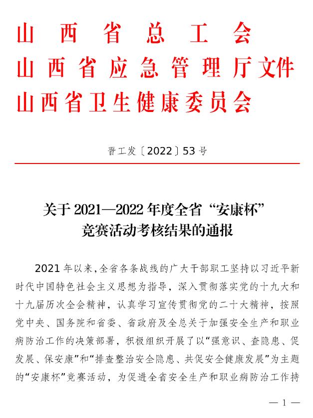 在2021-2022年“安康杯”競(jìng)賽活動(dòng)中,一大批先進(jìn)集體和優(yōu)秀個(gè)人脫穎而出,為促進(jìn)全省安全生產(chǎn)和職業(yè)病防治工作持續(xù)穩(wěn)步好轉(zhuǎn)作出了積極貢獻(xiàn)。為激勵(lì)先進(jìn)、樹(shù)立典型,進(jìn)一步調(diào)動(dòng)廣大職工干事創(chuàng)業(yè)的積極性,省總工會(huì)、省應(yīng)急管理廳和省衛(wèi)生健康委員會(huì)決定對(duì)山西焦煤西山煤電集團(tuán)有限責(zé)任公司東曲礦等10個(gè) “安全明星企業(yè)”、國(guó)家能源集團(tuán)神東煤炭集團(tuán)保德煤礦大學(xué)生智能化采煤班等10個(gè)“安全示范班組”、長(zhǎng)治市潞城區(qū)應(yīng)急管理局安全公益宣教基地安全志愿者宋衛(wèi)國(guó)等10名“安全衛(wèi)士”以及太原西北二環(huán)高速公路發(fā)展有限公司等88個(gè)“優(yōu)勝單位”、山西金蘭化工股份有限公司包裝車(chē)間甲班等50個(gè)“優(yōu)勝班組”、中國(guó)定武集團(tuán)工會(huì)干事安靜等60名“安全標(biāo)兵”、華新燃?xì)饧瘓F(tuán)有限公司等30個(gè)“優(yōu)秀組織單位”進(jìn)行通報(bào)表?yè)P(yáng)。