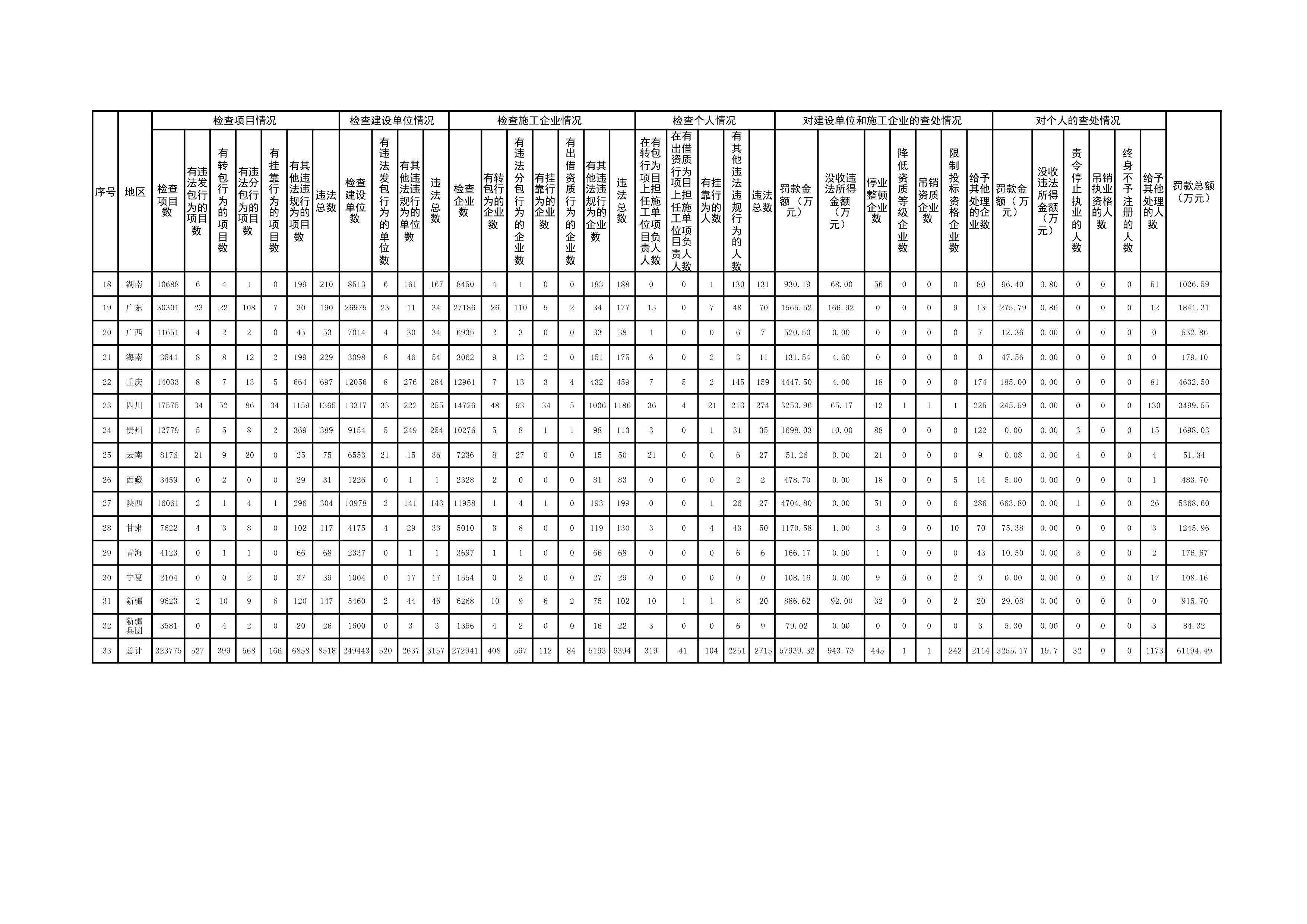 各地住房和城鄉(xiāng)建設(shè)主管部門對存在違法違規(guī)行為的企業(yè)和人員,分別采取停業(yè)整頓、降低資質(zhì)等級、吊銷資質(zhì)、責(zé)令停止執(zhí)業(yè)、通報(bào)批評、沒收違法所得、罰款、信用懲戒等行政處罰或行政管理措施。其中,責(zé)令停業(yè)整頓的企業(yè)445家,降低資質(zhì)等級的企業(yè)1家,吊銷資質(zhì)的企業(yè)1家,限制投標(biāo)資格的企業(yè)242家,給予通報(bào)批評、信用懲戒等處理的企業(yè)2114家;責(zé)令停止執(zhí)業(yè)32人,給予通報(bào)批評等處理1173人;沒收違法所得總額963.43萬元(含個(gè)人違法所得19.7萬元),罰款總額61194.49萬元(含個(gè)人罰款3255.17萬元)。