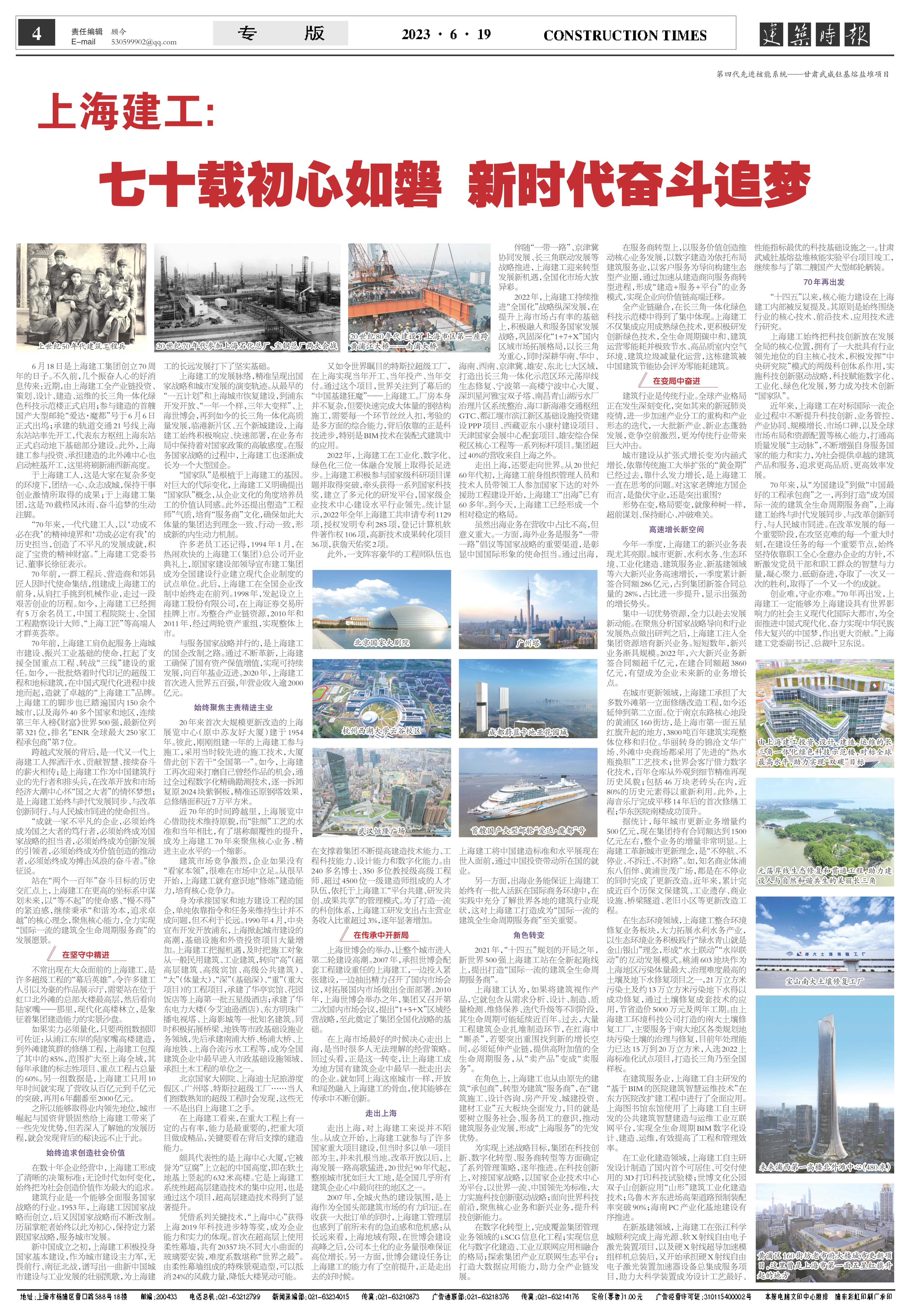 今天是上海建工集團(tuán)創(chuàng)立70周年的日子。不久前,幾個振奮人心的好消息傳來:近期,由上海建工全產(chǎn)業(yè)鏈投資、策劃、設(shè)計(jì)、建造、運(yùn)維的長三角一體化綠色科技示范樓正式啟用;參與建造的首艘國產(chǎn)大型郵輪“愛達(dá)·魔都”號于6月6日正式出塢;承建的軌道交通21號線上海東站站率先開工,代表東方樞紐上海東站正式啟動地下基礎(chǔ)部分建設(shè)。此外,上海建工參與投資、承擔(dān)建造的北外灘中心也啟動樁基開工,這里將刷新浦西新高度。