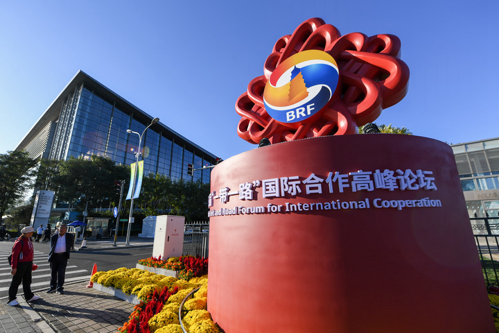 10月14日在北京國家會(huì)議中心附近拍攝的第三屆“一帶一路”國際合作高峰論壇景觀布置。新華社記者 鞠煥宗 攝