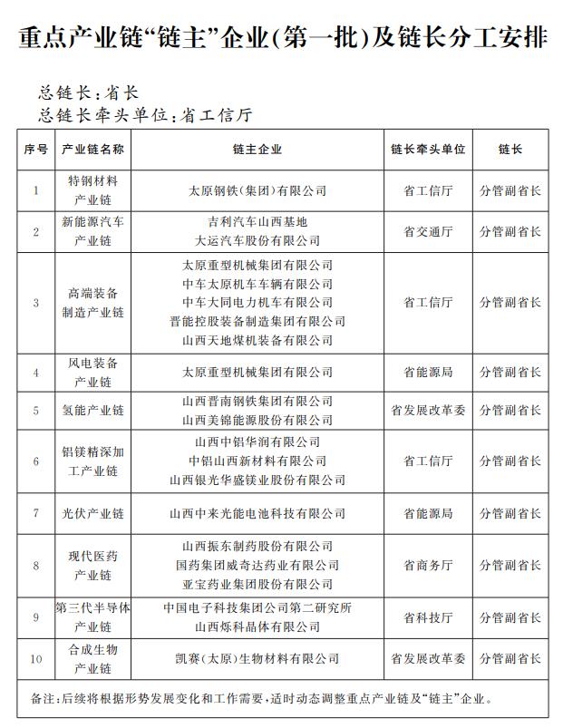 以下為山西資本圈根據(jù)兩批名單梳理的重點產(chǎn)業(yè)鏈和“鏈主”企業(yè)最新名單: