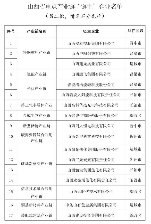 近日,山西省工信廳發(fā)布第二批山西省重點產(chǎn)業(yè)鏈“鏈主”企業(yè)公示名單,此次共有17家企業(yè)“上榜”,共涉及11條重點產(chǎn)業(yè)鏈。