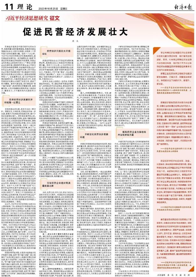 民營經(jīng)濟(jì)是社會主義市場經(jīng)濟(jì)發(fā)展的重要成果,是推動社會主義市場經(jīng)濟(jì)發(fā)展的重要力量。黨的十八大以來,以習(xí)近平同志為核心的黨中央對民營經(jīng)濟(jì)發(fā)展和民營企業(yè)家成長給予高度重視,強調(diào)“我國民營經(jīng)濟(jì)只能壯大、不能弱化,不僅不能‘離場’,而且要走向更加廣闊的舞臺”。黨的二十大報告鮮明提出“促進(jìn)民營經(jīng)濟(jì)發(fā)展壯大”,這是長久之策,不是權(quán)宜之計。