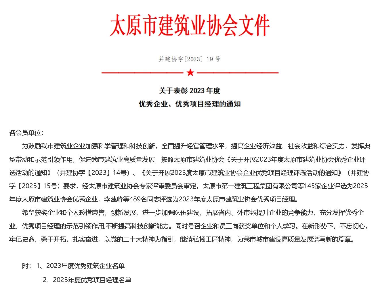 關(guān)于表彰2023年度優(yōu)秀企業(yè)、優(yōu)秀項(xiàng)目經(jīng)理的通知