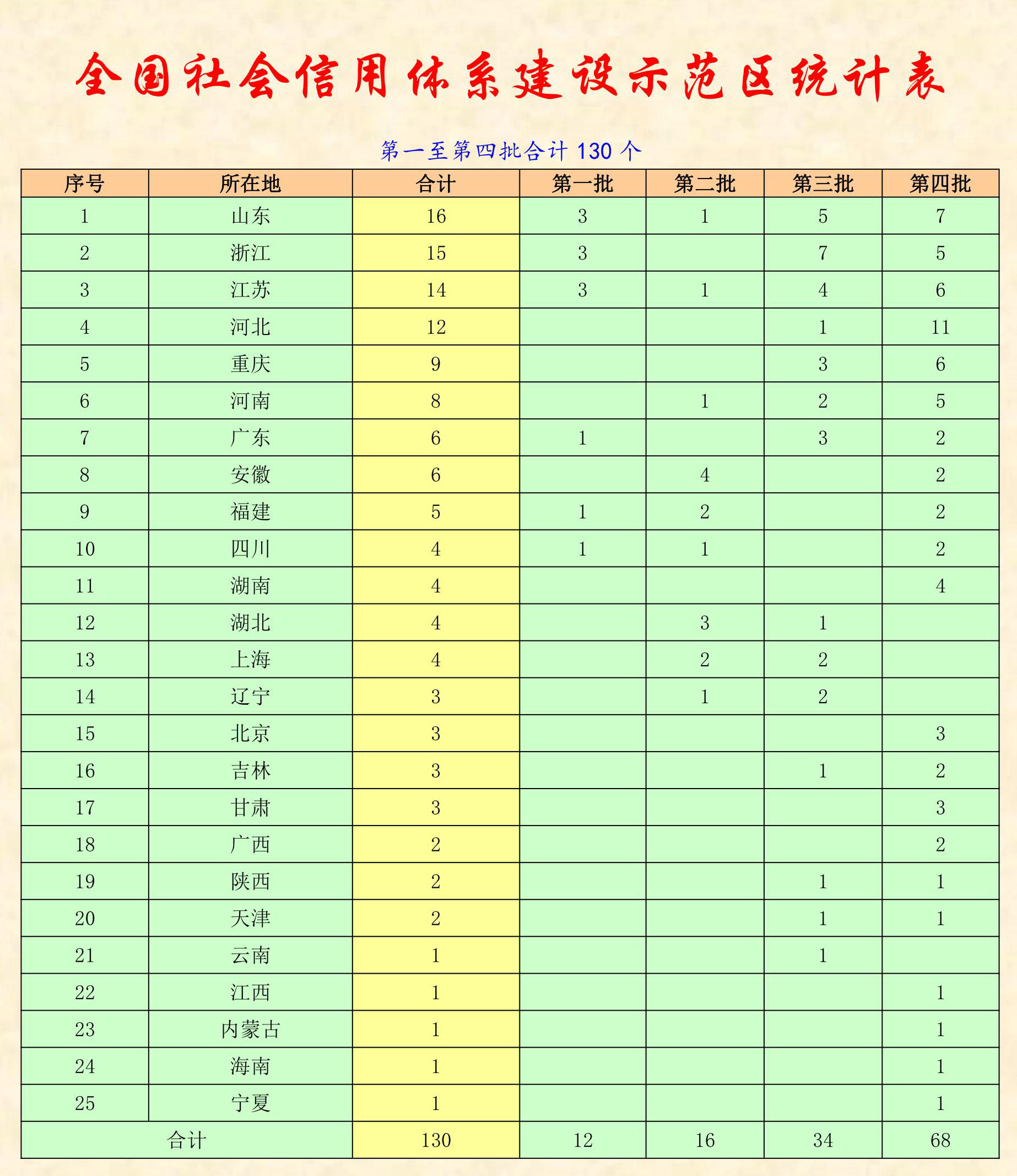 今年8月,國家發(fā)展改革委、中國人民銀行聯(lián)合發(fā)布了第四批社會信用體系建設(shè)示范區(qū)名單,68個地區(qū)入選。目前,全國共有130個信用示范區(qū),覆蓋25個省份。