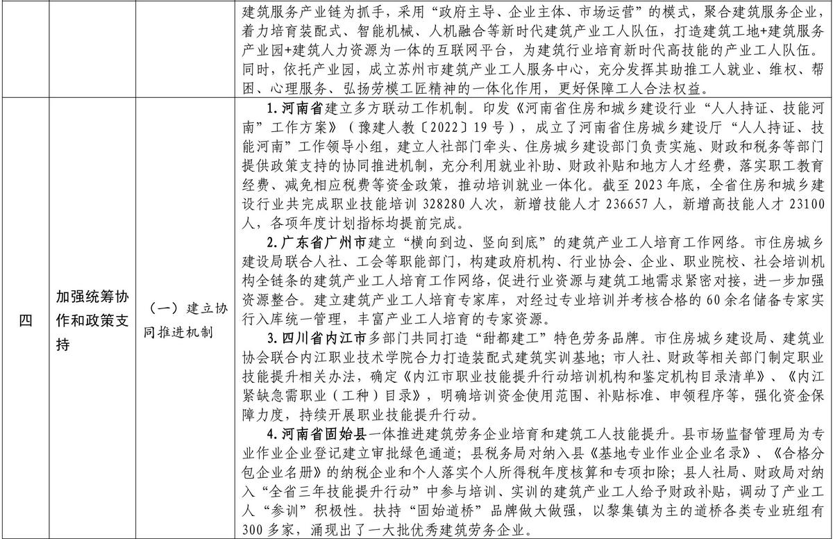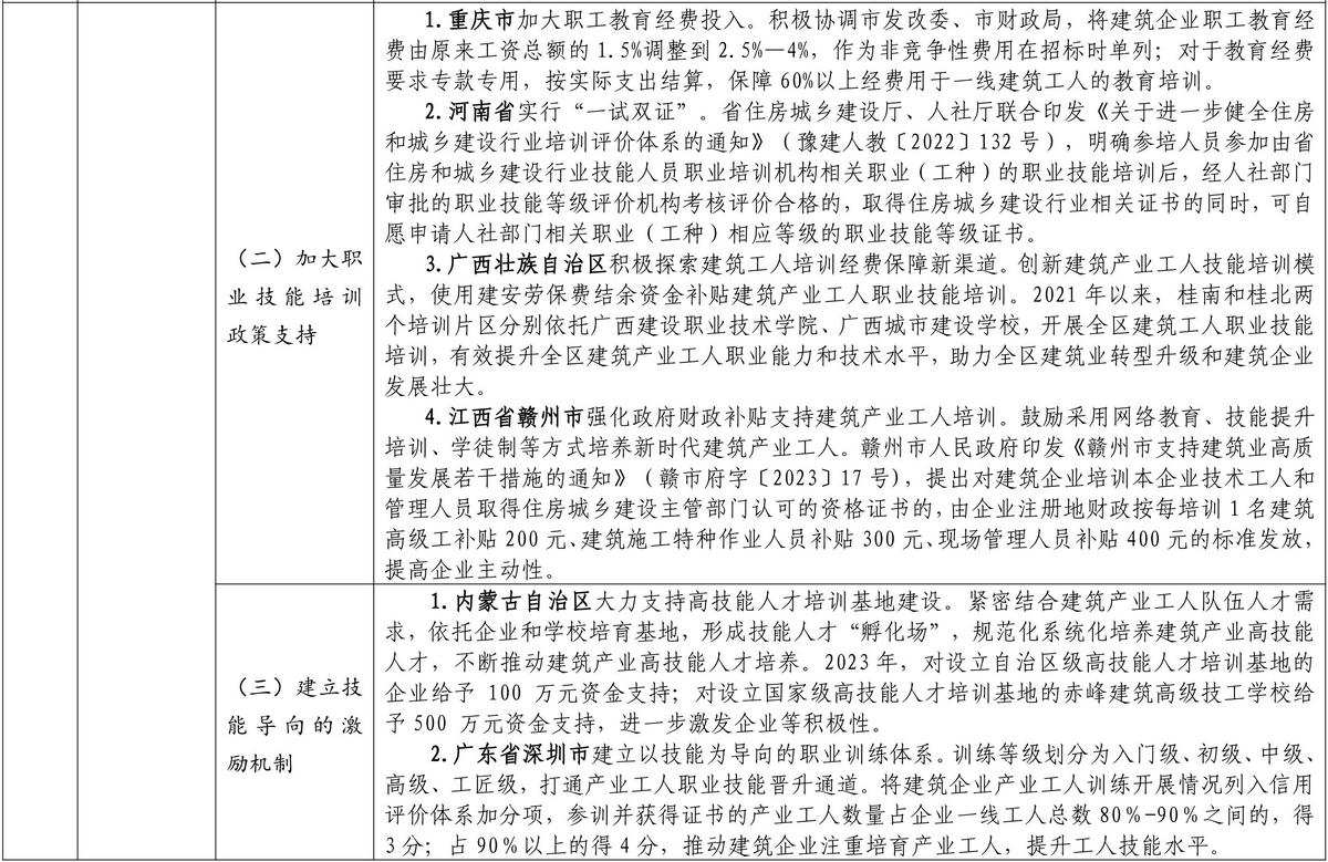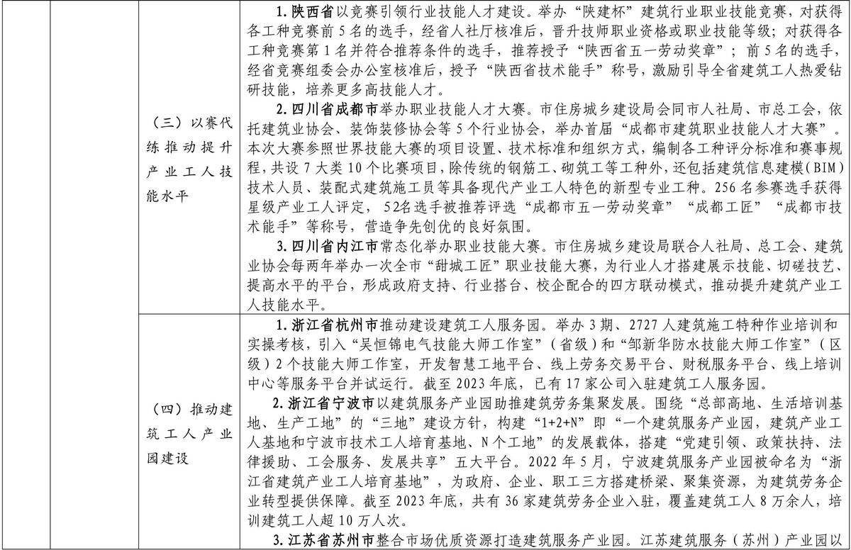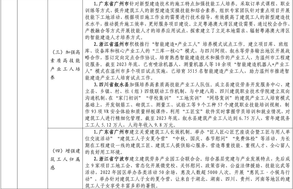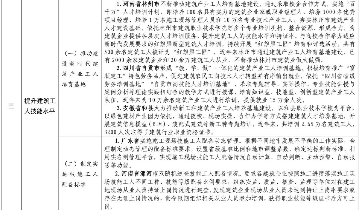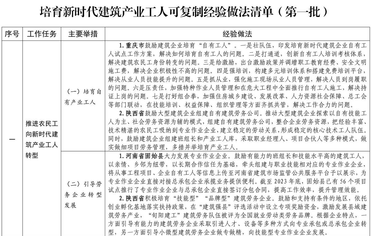 按照《住房和城鄉(xiāng)建設部等部門關于加快培育新時代建筑產(chǎn)業(yè)工人隊伍的指導意見》要求,各地圍繞推進農(nóng)民工向新時代建筑產(chǎn)業(yè)工人轉型、完善建筑工人實名制管理、提升建筑工人技能水平、加強統(tǒng)籌協(xié)作和政策支持、保障建筑工人合法權益等方面,積極探索、大力推進新時代建筑產(chǎn)業(yè)工人隊伍建設,取得了積極成效。近日,住房和城鄉(xiāng)建設部印發(fā)培育新時代建筑產(chǎn)業(yè)工人可復制經(jīng)驗做法清單(第一批)。