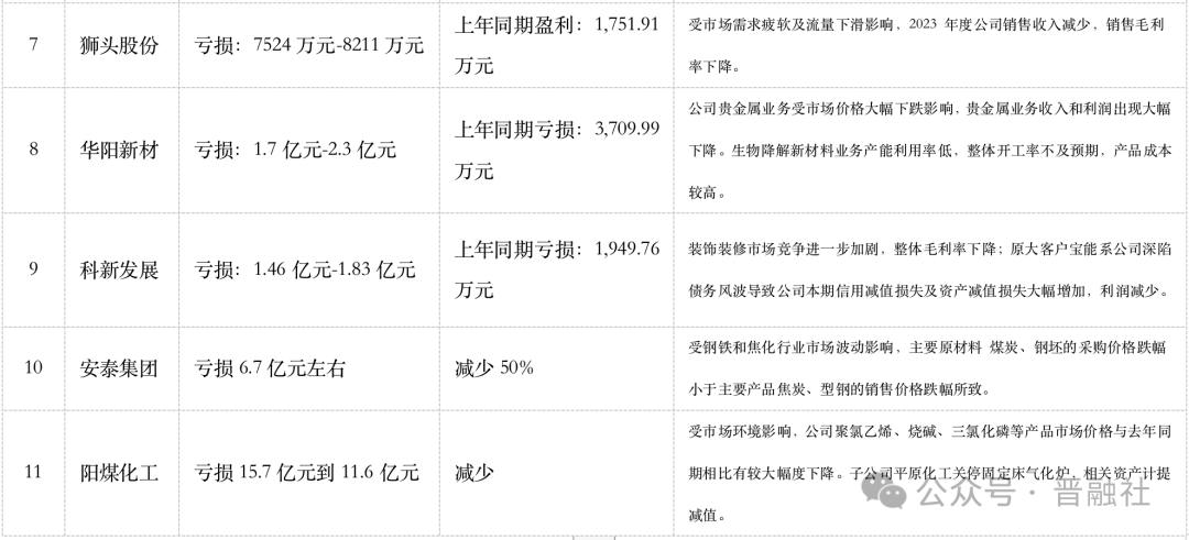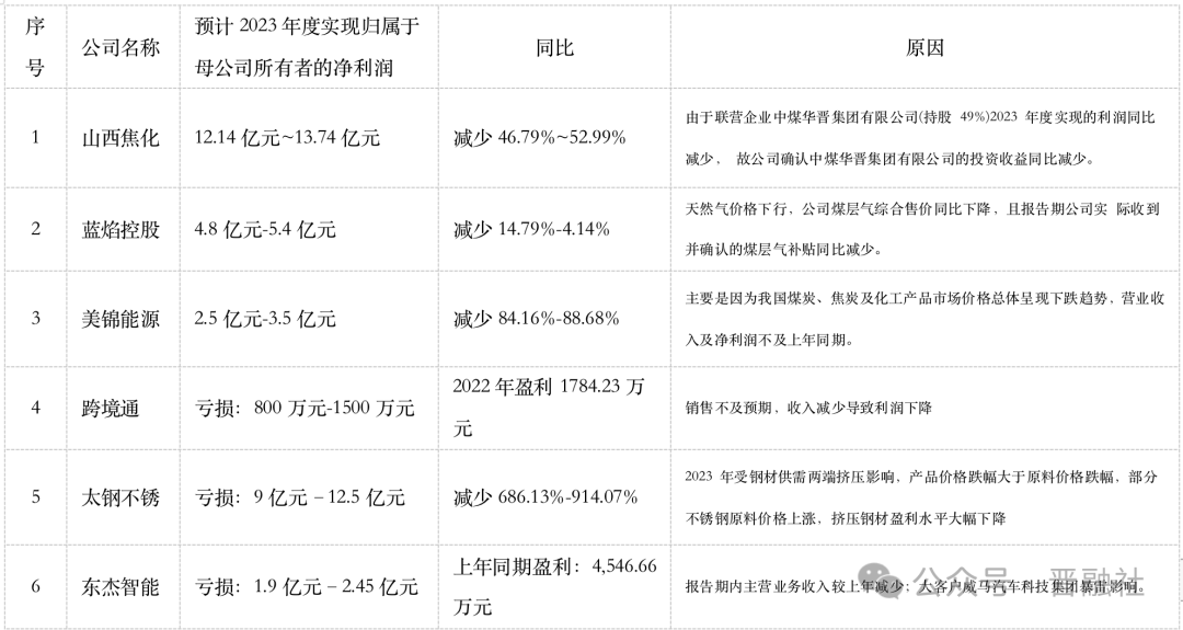 太鋼不銹預(yù)計(jì)2023年虧損9億元–12.5億元,同比減少686.13%-914.07%;美錦能源預(yù)計(jì)2023年凈利潤為2.5億元-3.5億元,同比減少84.16%-88.68%;華陽新材預(yù)計(jì)2023年虧損1.7億元-2.3億元,2022年虧損0.37億元……這些企業(yè)業(yè)績下滑原因多系市場行情影響所致。