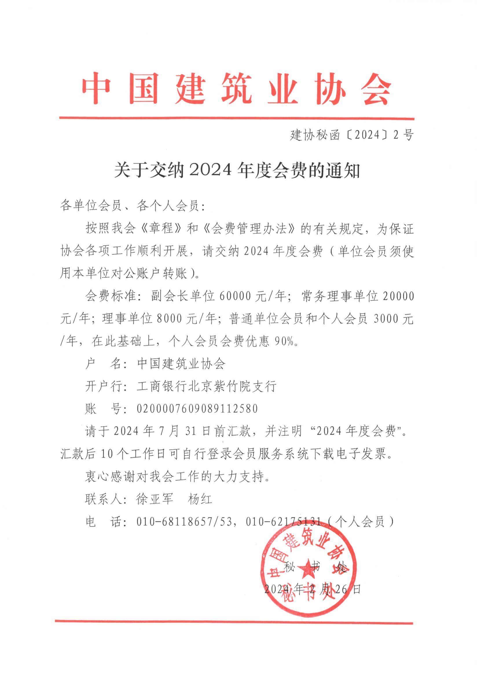 中國建筑業(yè)協(xié)會關(guān)于交納2024年度會費(fèi)的通知