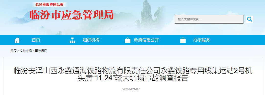 據(jù)山西省臨汾市應(yīng)急管理局網(wǎng)站消息,近日,臨汾市應(yīng)急管理局發(fā)布《臨汾安澤山西永鑫通海鐵路物流有限責(zé)任公司永鑫鐵路專用線集運(yùn)站2號(hào)機(jī)頭房“11.24”較大坍塌事故調(diào)查報(bào)告》。9人被建議移交司法機(jī)關(guān)依法處理,26人被給予黨紀(jì)政紀(jì)處理,5家事故相關(guān)企業(yè)及11名相關(guān)責(zé)任人員被給予行政處罰。