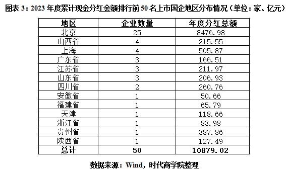 從地區(qū)分布情況來看,如圖表3所示,2023年度累計現(xiàn)金分紅金額排名前50的上市國企中,北京地區(qū)占據(jù)半數(shù),總計25家;山西省、上海市各4家,廣東省、江蘇省、山東省各3家;四川省2家;安徽省、福建省、天津、浙江省、貴州省、陜西省各1家。