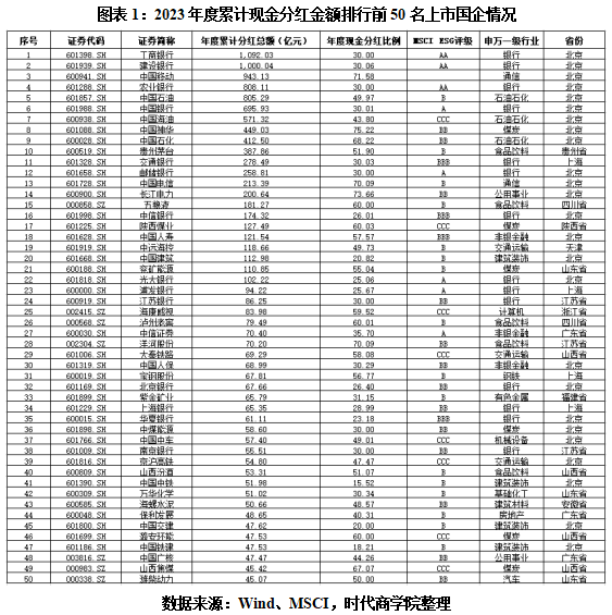 如圖表1所示,時代商學院梳理了2023年上市國企中年度累計現(xiàn)金分紅金額排行前50名企業(yè),從而為A股市場樹立優(yōu)質上市國企高質量發(fā)展風向標。