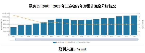 如圖表2所示,2021—2023年,工商銀行的年度累計現(xiàn)金分紅金額分別為1045.34億元、1081.69億元、1092.03億元,連續(xù)三年超千億元,呈連續(xù)增長態(tài)勢。2007—2023年,工商銀行連續(xù)17年穩(wěn)居A股上市國企“分紅王”寶座。