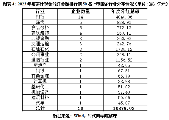 此外,從行業(yè)分布情況來看,如圖表4所示,2023年度累計現(xiàn)金分紅金額排名前50的上市國企中,數(shù)量最多的為上市銀行(申萬一級,下同),共14家,占比達28%。
