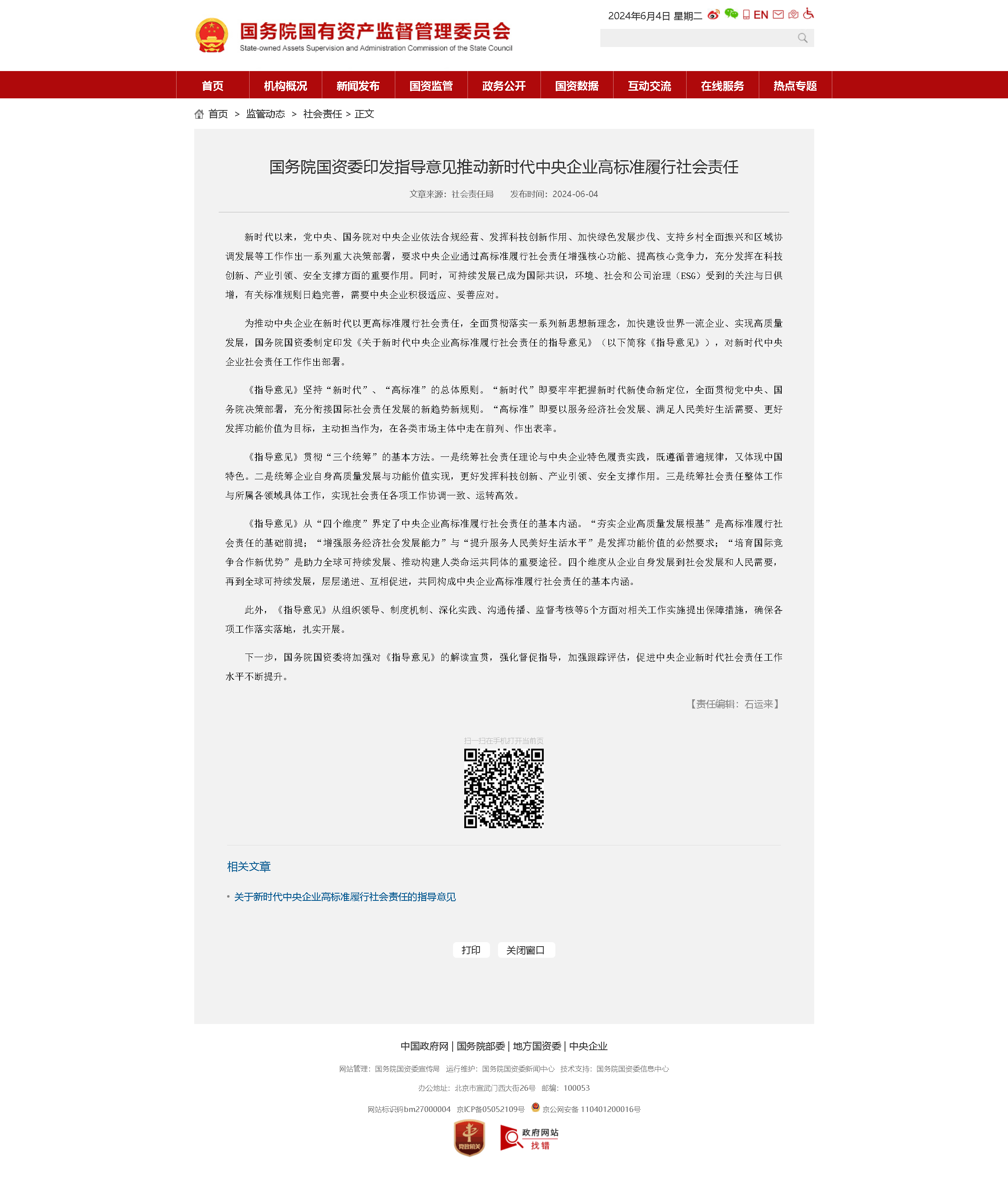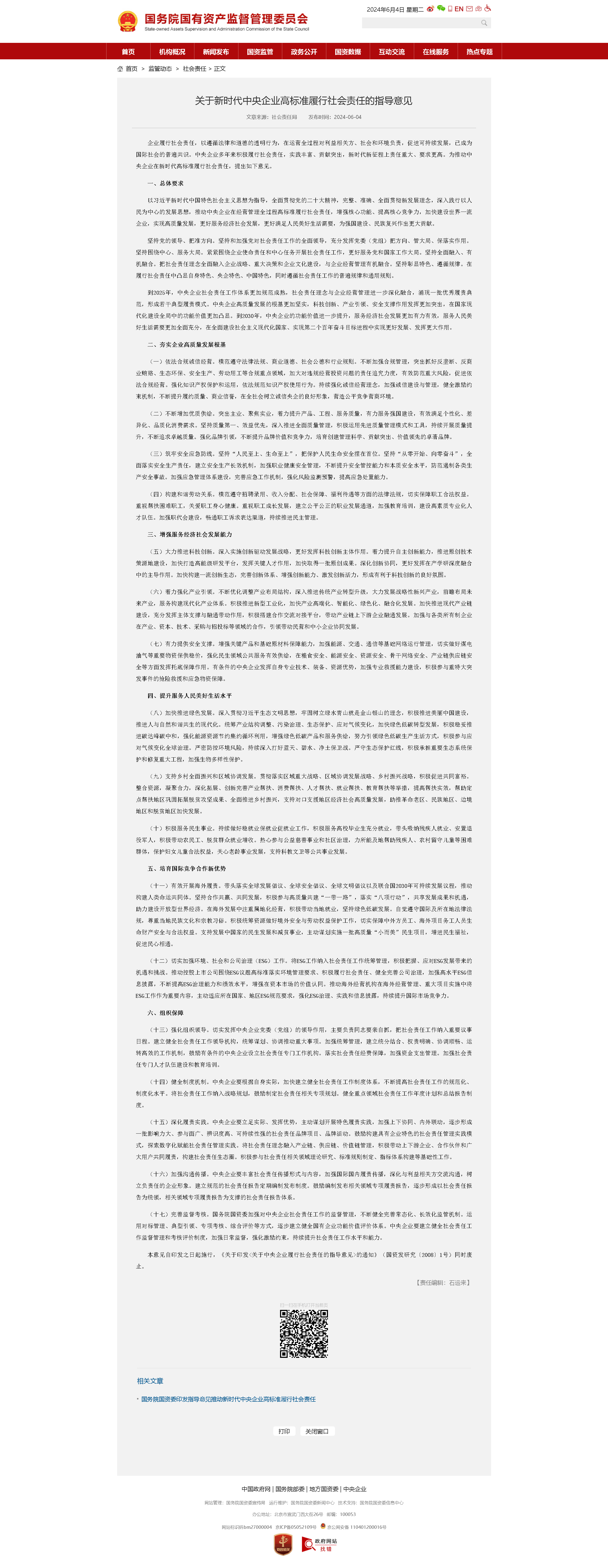 (十七)完善監(jiān)督考核。國務(wù)院國資委加強對中央企業(yè)社會責任工作的監(jiān)督管理,不斷健全完善常態(tài)化、長效化監(jiān)管機制。運用對標管理、典型引領(lǐng)、專項考核、綜合評價等方式,逐步建立健全國有企業(yè)功能價值評價體系。中央企業(yè)要建立健全社會責任工作監(jiān)督管理和考核評價制度,加強日常監(jiān)督,強化激勵約束,持續(xù)提升社會責任工作水平和能力。