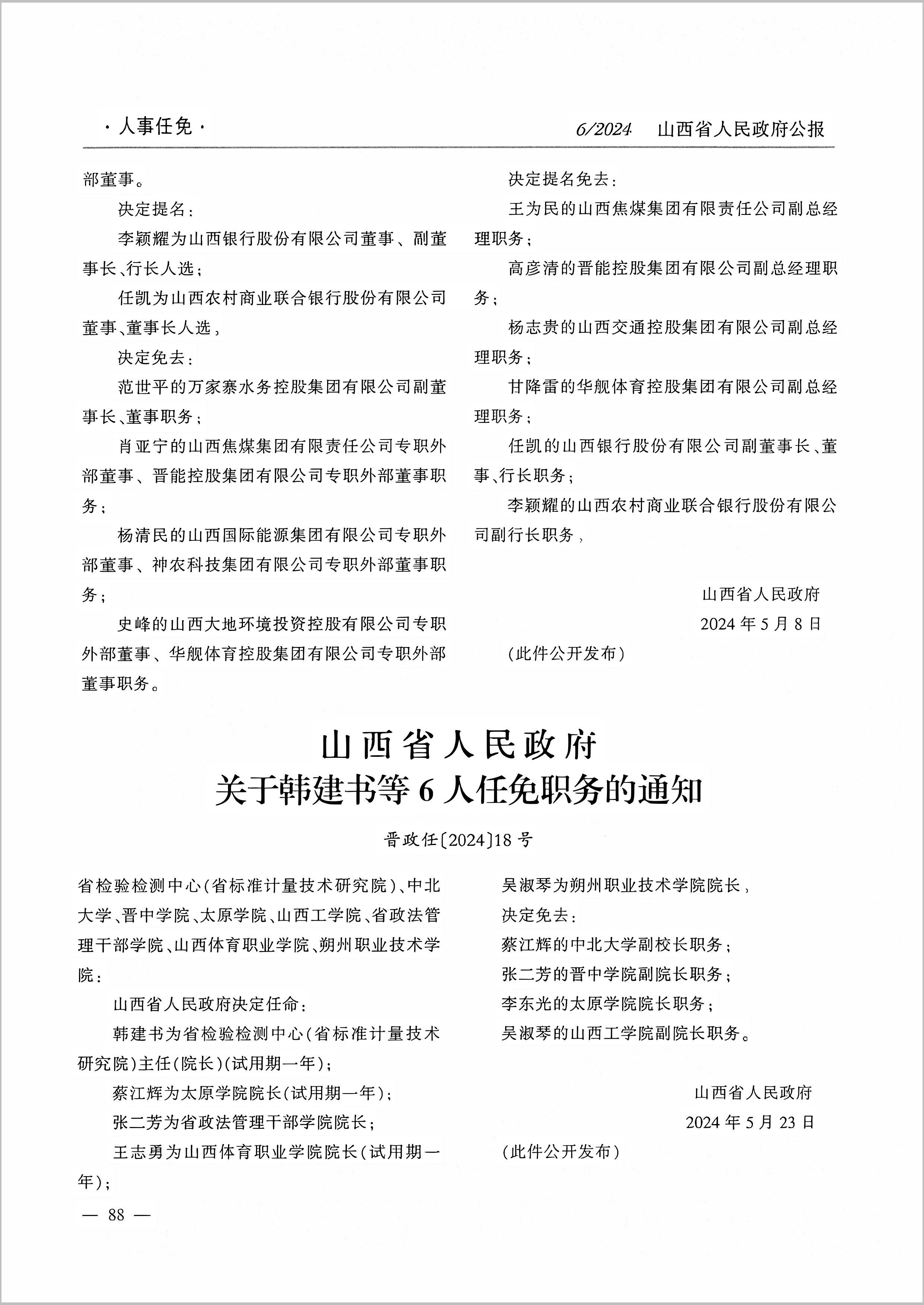 決定任命——韓建書為省檢驗檢測中心(省標準計量技術研究院)主任(院長);蔡江輝為太原學院院長;張二芳為省政法管理干部學院院長;王志勇為山西體育職業(yè)學院院長;吳淑琴為朔州職業(yè)技術學院院長。